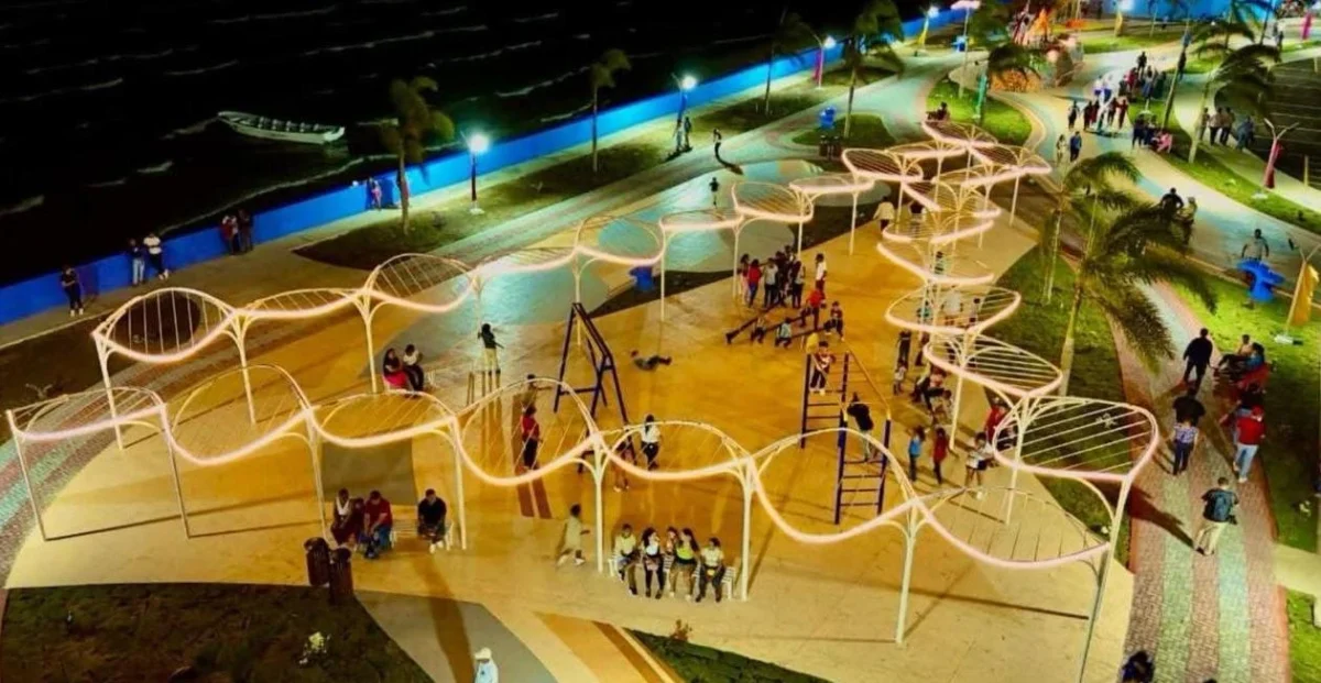 El malecón cuenta con áreas para la recreación de las Familias, juegos infantiles, parque acuático, todos ambientados con temática propia del Municipio.