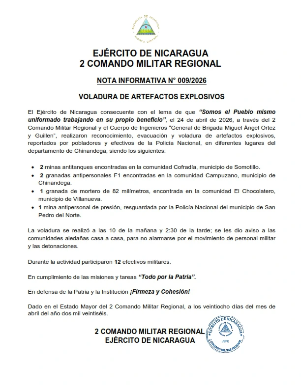 El Ejército de Nicaragua consecuente con el lema de que “Somos el Pueblo mismo uniformado trabajando en su propio beneficio”, el 21 de abril de 2026, en cumplimiento a la Estrategia de Estado “Muro de Contención” y a través de servicio operativo del Distrito Naval Caribe en las coordenadas φ=12°40’37″N – ʎ=083°32’59″W, a 500 metros al norte de la comunidad de Tasbapounie, Región Autónoma de la Costa Caribe Sur, realizó la incautación de 4 paquete rectangulares de marihuana, los que eran trasladados por 3 ciudadanos, a bordo de 1 embarcación tipo panga de nombre “Charlyn y Brandon”.