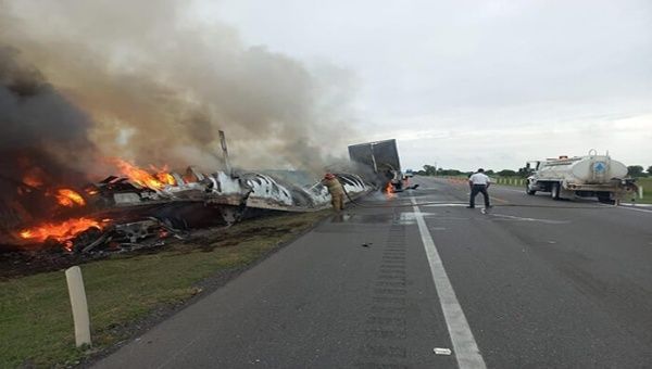 El accidente entre un tráiler y una camioneta ocurrió en un tramo de una carretera local. Tras la colisión los dos vehículos se prendieron en llamas y provocando una fuerte movilización de elementos de emergencia y seguridad.