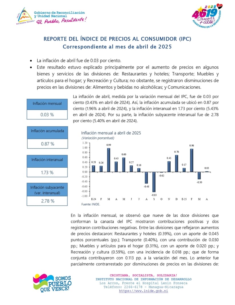 La inflación de abril, medida por la variación mensual del IPC, fue de 0.03 por ciento (0.43% en abril de 2024). Así, la inflación acumulada se ubicó en 0.87 por ciento (1.96% a abril de 2024), y la inflación interanual en 1.73 por ciento (5.43% en abril de 2024). Por su parte, la inflación subyacente interanual fue de 2.78 por ciento (5.40% en abril de 2024).