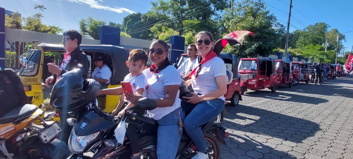 Ondeando las banderas Roja y Negra, Azul, Blanca y Azul, consignas revolucionarias y la algarabía de la militancia sandinista, inicia caravana de motociclista, caponeras, bicicletas, en saludo al Día de la Alegría.