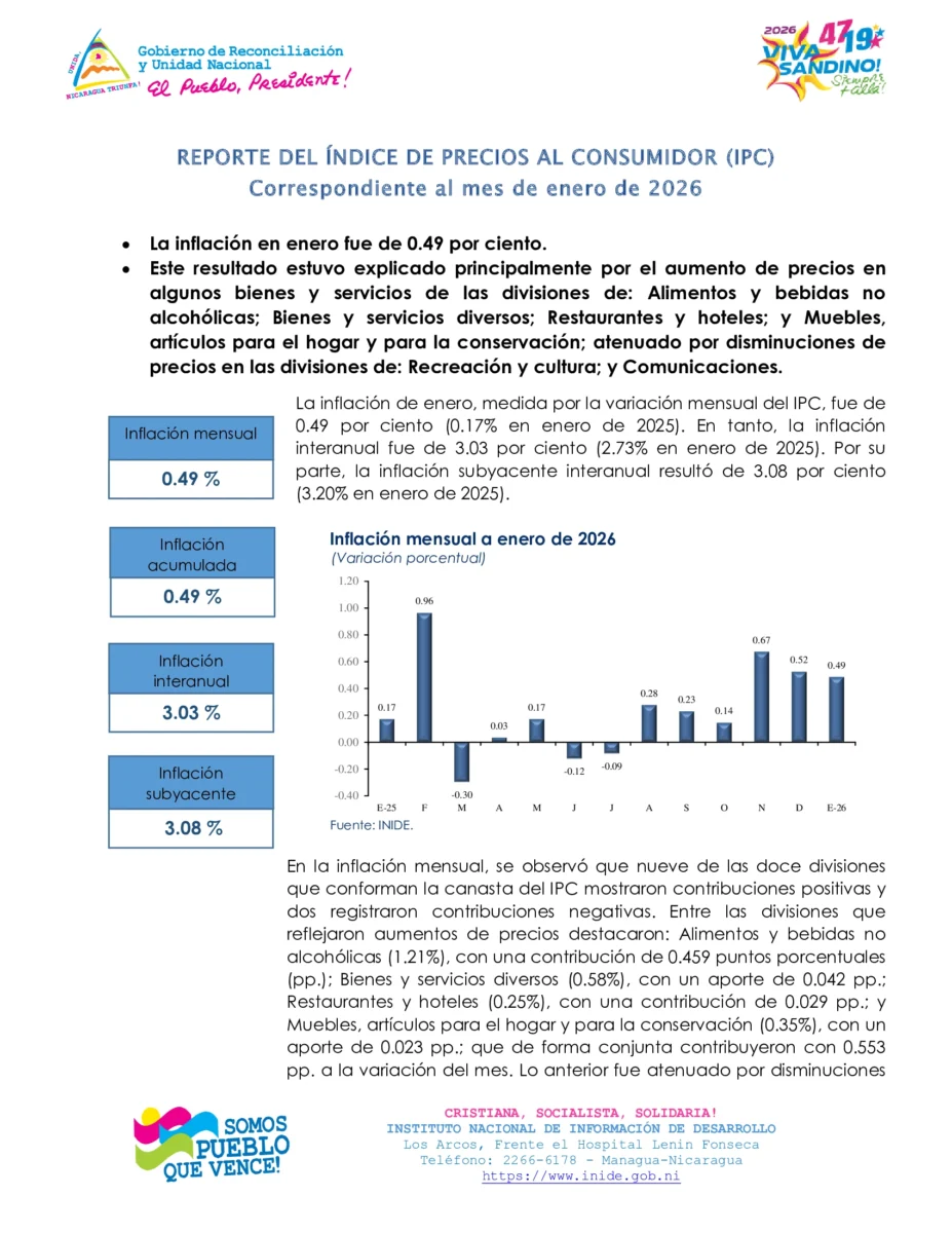 La inflación de enero, medida por la variación mensual del IPC, fue de 0.49 por ciento (0.17% en enero de 2025). En tanto, la inflación interanual fue de 3.03 por ciento (2.73% en enero de 2025). Por su parte, la inflación subyacente interanual resultó de 3.08 por ciento (3.20% en enero de 2025).