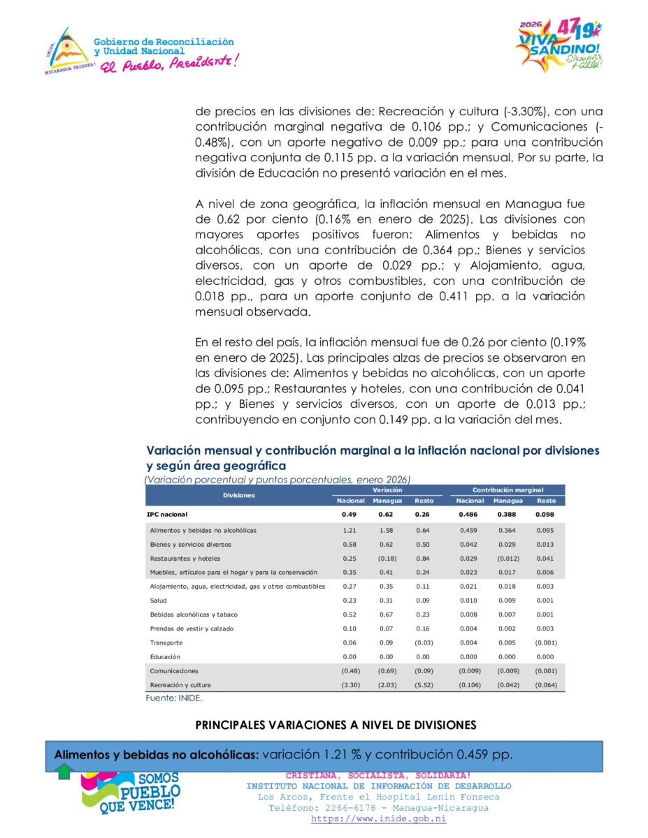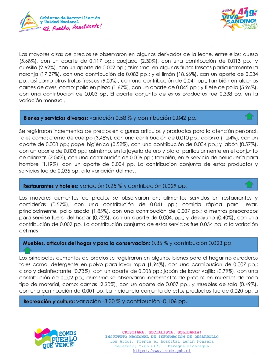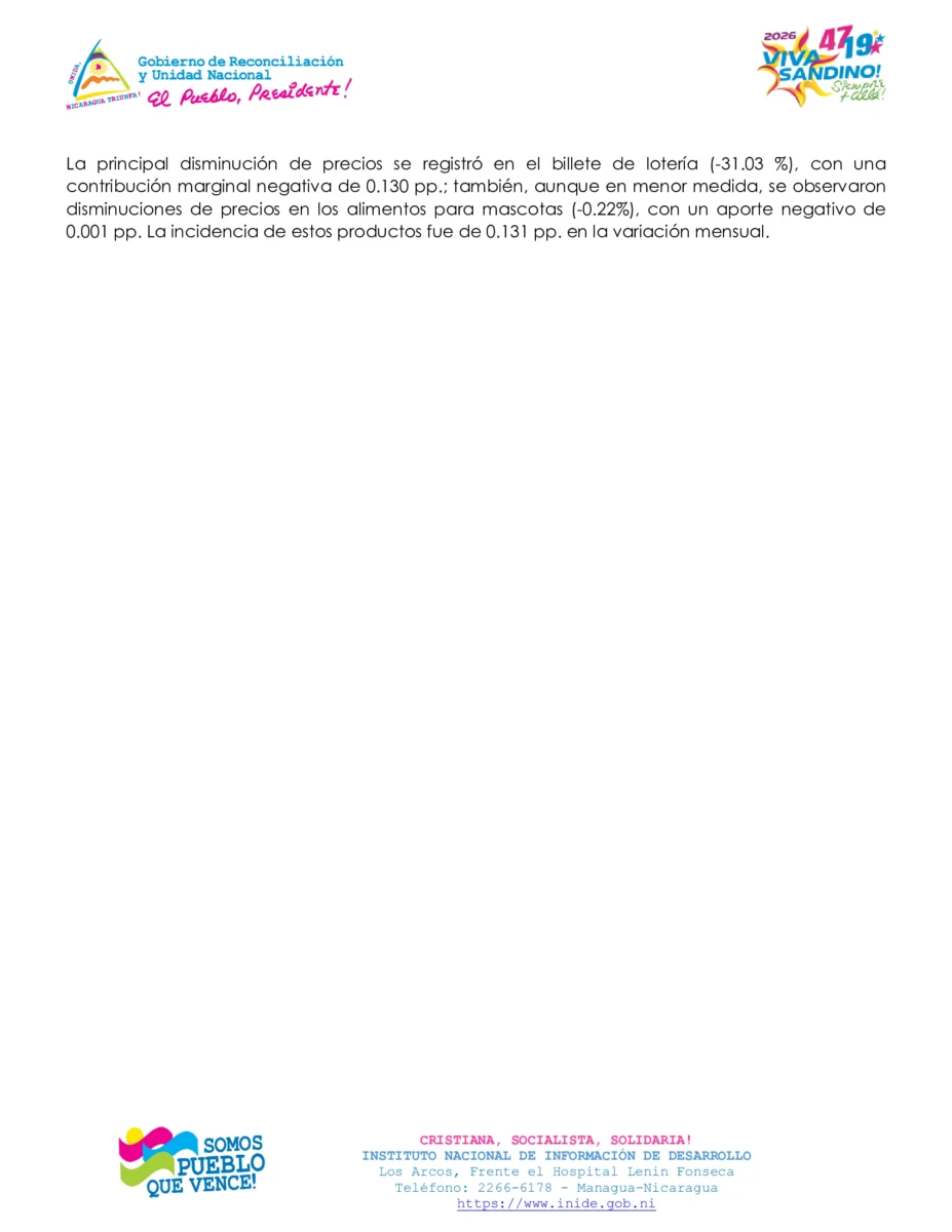 Lo anterior fue atenuado por disminuciones de precios en las divisiones de: Recreación y cultura (-3.30%), con una contribución marginal negativa de 0.106 pp.; y Comunicaciones (-0.48%), con un aporte negativo de 0.009 pp.; para una contribución negativa conjunta de 0.115 pp. a la variación mensual. Por su parte, la división de Educación no presentó variación en el mes.