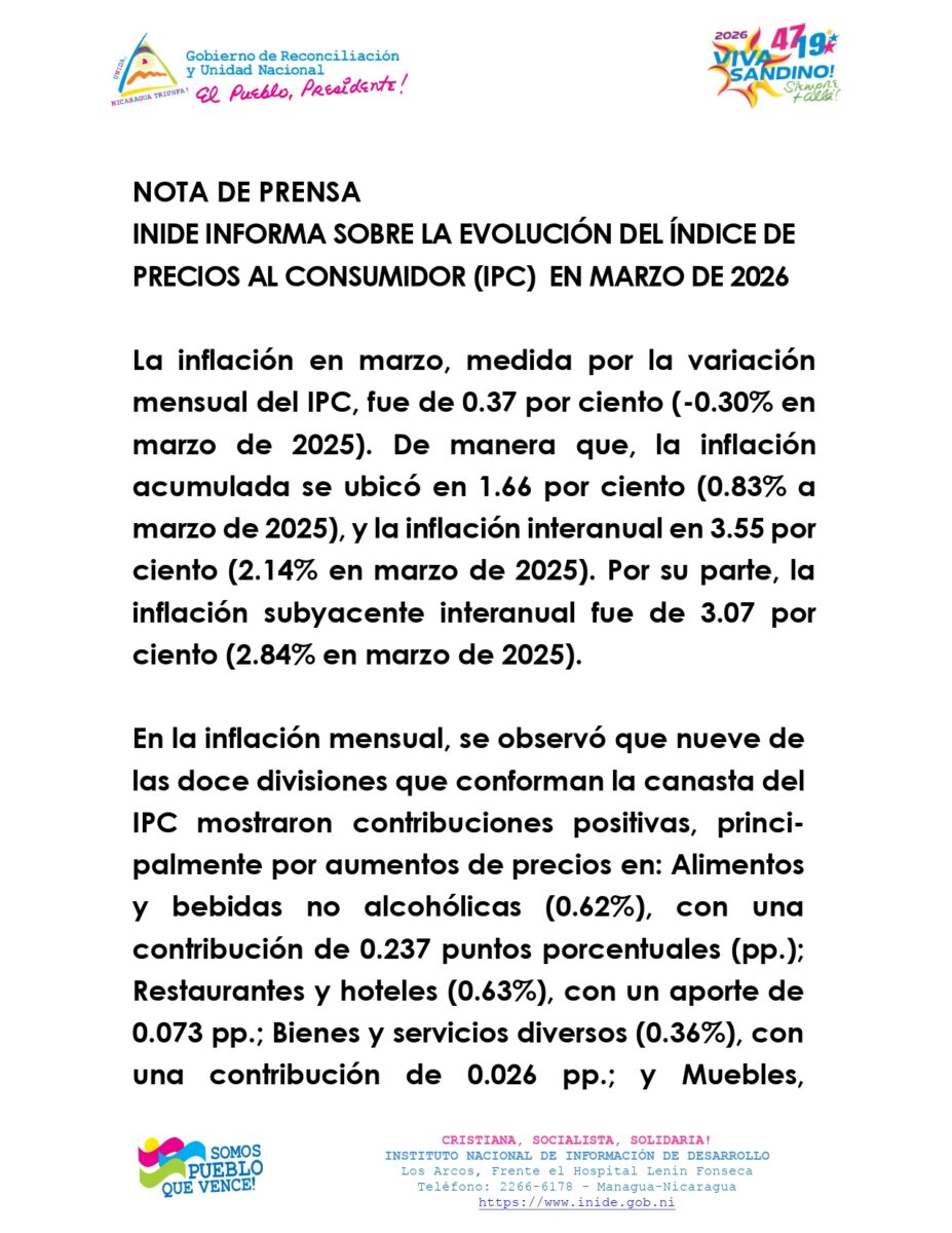 INIDE informa sobre la Evolución del Índice de Precios al Consumidor (IPC) en marzo de 2026