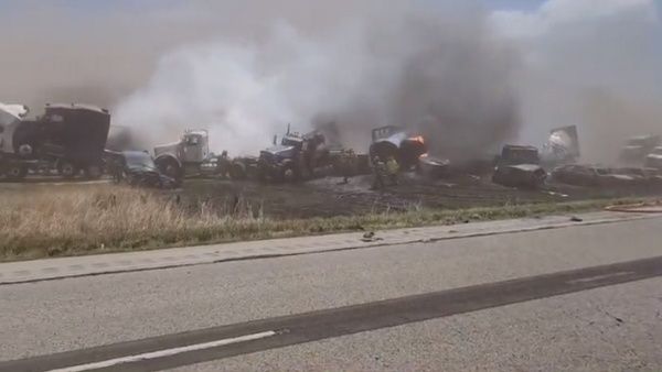 El texto emitido afirma que dos camiones con remolque se incendiaron y al menos 40 o 50 automóviles y cerca de 60 personas se vieron involucradas en el incidente.
