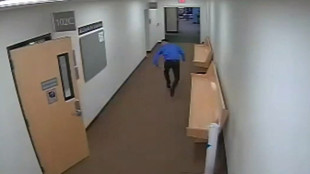 Cuando ya no llevaba las esposas, el acusado aprovechó la oportunidad y salió corriendo de la sala de audiencias, por lo que dos oficiales salieron tras él, persiguiéndolo por pasillos y escaleras sin conseguir detenerlo.