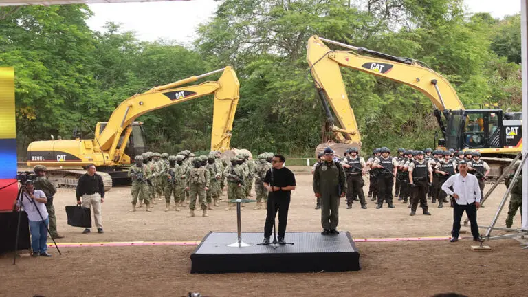 «Hoy marcamos uno de los hitos más importantes en nuestra lucha en contra del terrorismo y las mafias que se enquistaron impunemente en nuestro país durante décadas», dijo Noboa al colocar la primera piedra para la construcción de la cárcel.