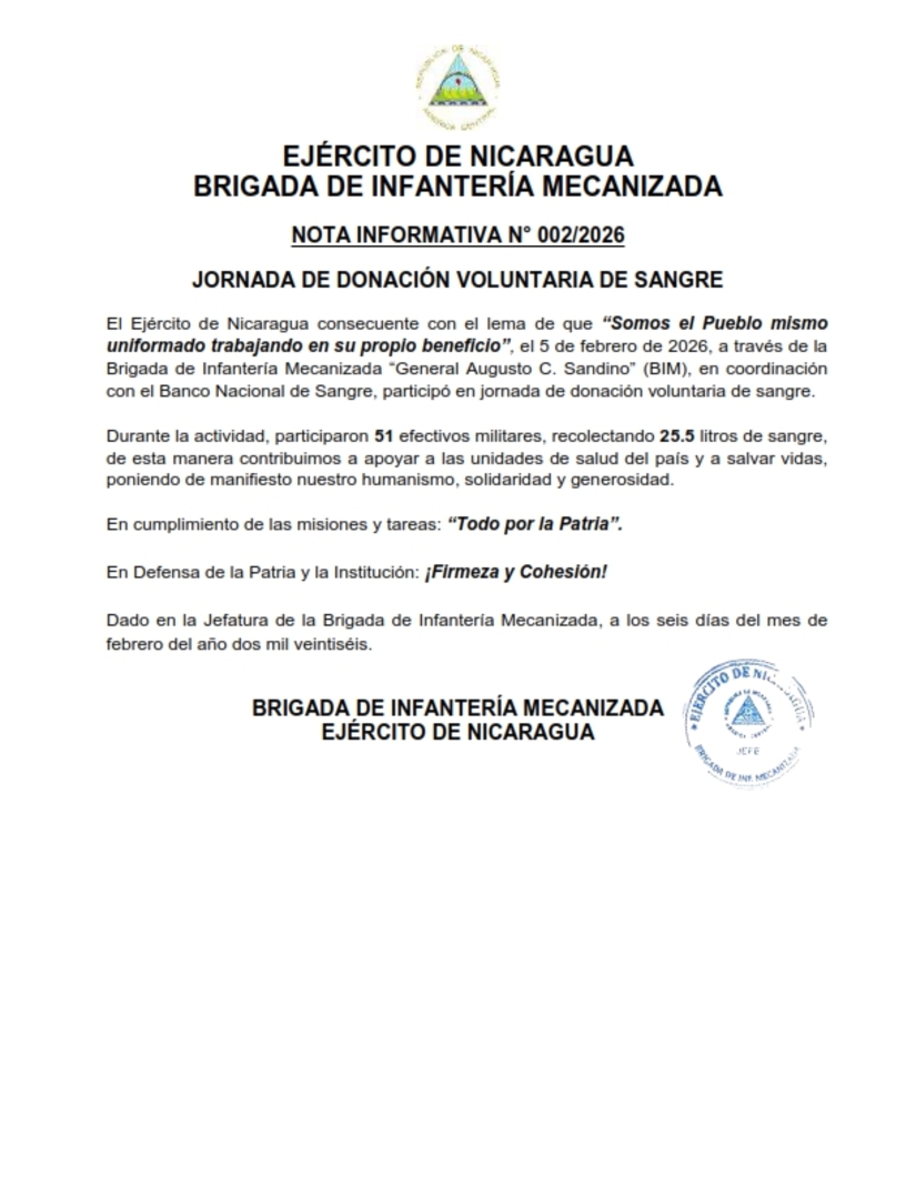 El Ejército de Nicaragua consecuente con el lema de que “Somos el Pueblo mismo uniformado trabajando en su propio beneficio”, el 5 de febrero de 2026, a través de la Brigada de Infantería Mecanizada “General Augusto C. Sandino” (BIM), en coordinación con el Banco Nacional de Sangre, participó en jornada de donación voluntaria de sangre.