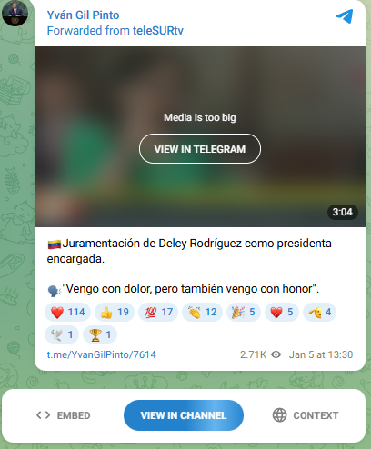 La compañera Delcy Rodríguez, fue juramentada este lunes como presidenta encargada de la República Bolivariana de Venezuela, tras el secuestro del presidente Nicolás Maduro, por parte de los Estados Unidos el pasado sábado.