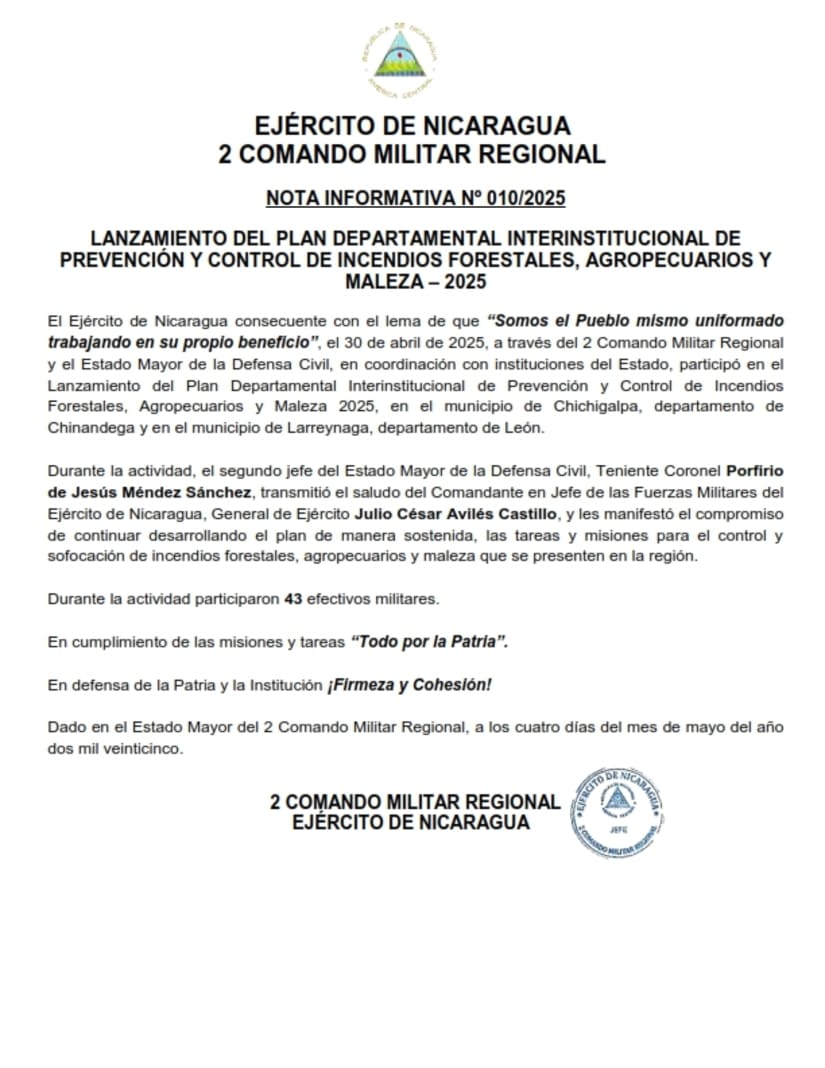 El Ejército de Nicaragua consecuente con el lema de que “Somos el Pueblo mismo uniformado trabajando en su propio beneficio”, el 30 de abril de 2025, a través del 2 Comando Militar Regional y el Estado Mayor de la Defensa Civil, en coordinación con instituciones del Estado, participó en el Lanzamiento del Plan Departamental Interinstitucional de Prevención y Control de Incendios Forestales, Agropecuarios y Maleza 2025, en el municipio de Chichigalpa, departamento de Chinandega y en el municipio de Larreynaga, departamento de León.