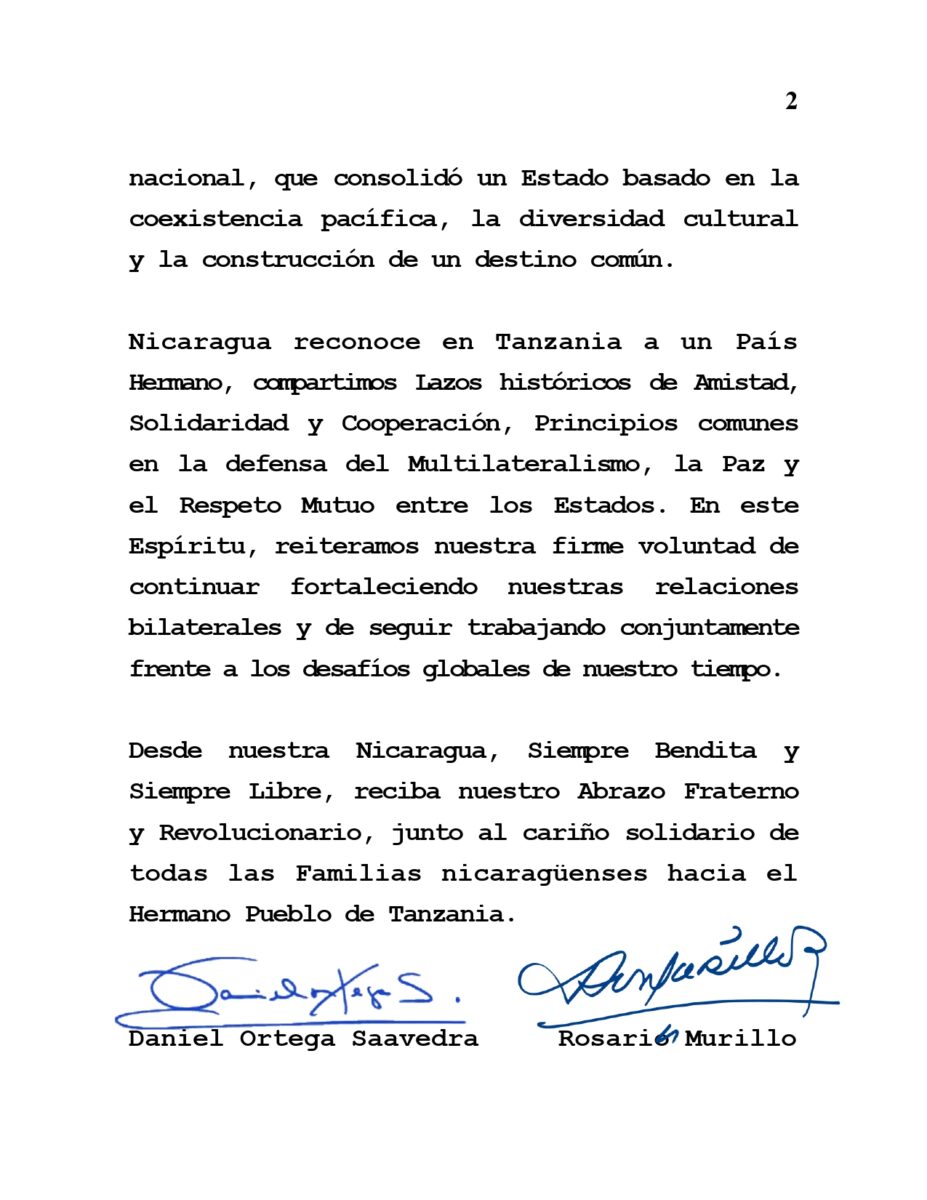 Desde nuestra Nicaragua, Siempre Bendita y Siempre Libre, reciba nuestro Abrazo Fraterno y Revolucionario, junto al cariño solidario de todas las Familias nicaragüenses hacia el Hermano Pueblo de Tanzania.
