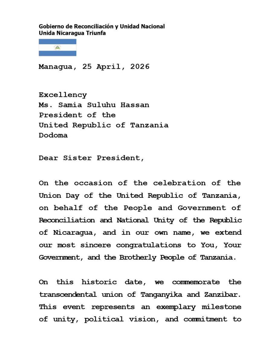On the occasion of the celebration of the Union Day of the United Republic of Tanzania, on behalf of the People and Government of Reconciliation and National Unity of the Republic of Nicaragua, and in our own name, we extend our most sincere congratulations to You, Your Government, and the Brotherly People of Tanzania.