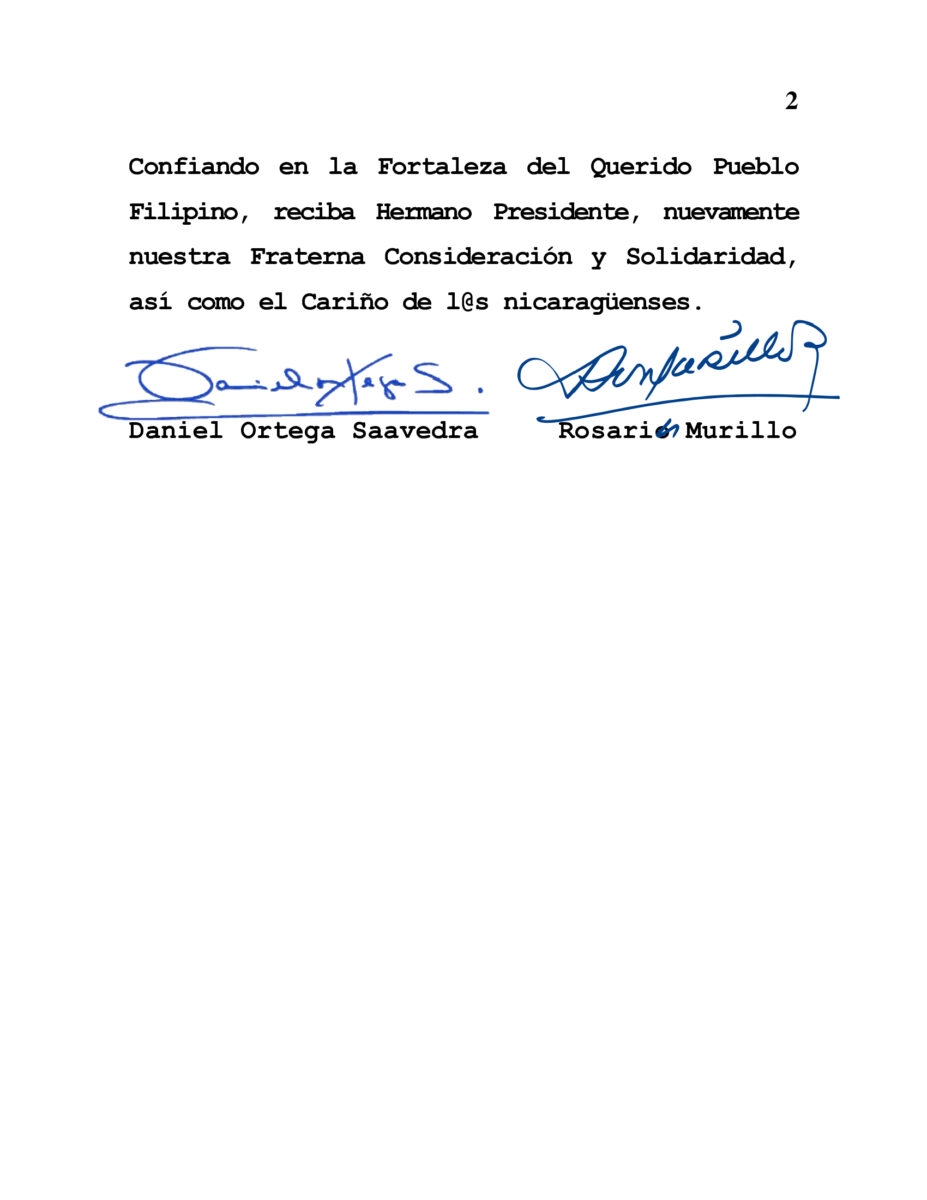 Confiando en la Fortaleza del Querido Pueblo Filipino, reciba Hermano Presidente, nuevamente nuestra Fraterna Consideración y Solidaridad, así como el Cariño de l@s nicaragüenses.