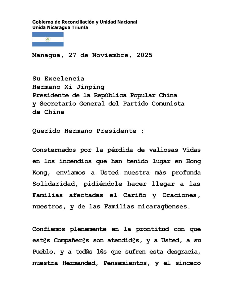 Mensaje de Condolencias y Solidaridad del Copresidente-Comandante Daniel, y la Copresidenta Compañera Rosario, a Su Excelencia, Hermano Xi Jinping, Presidente de la República Popular China y Secretario General del Partido Comunista de China, ante la pérdida de valiosas Vidas en los incendios que han tenido lugar en Hong Kong.