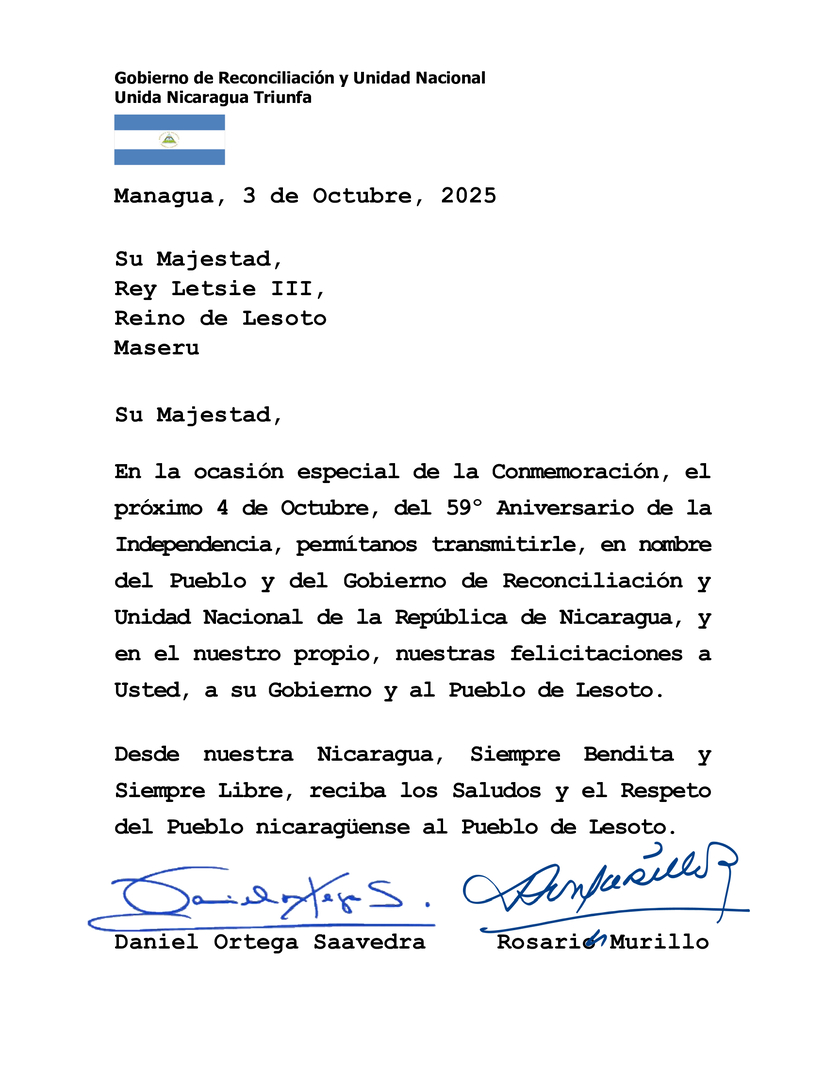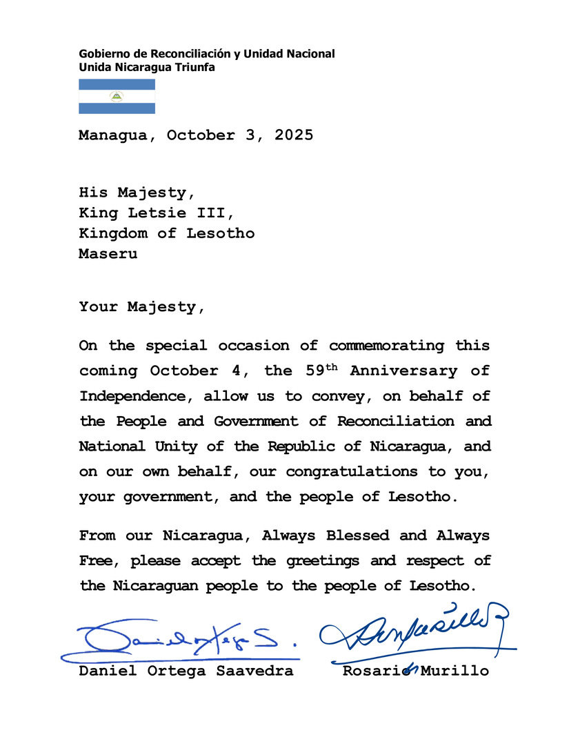En la ocasión especial de la Conmemoración, el próximo 4 de Octubre, del 59º Aniversario de la Independencia, permítanos transmitirle, en nombre del Pueblo y del Gobierno de Reconciliación y Unidad Nacional de la República de Nicaragua, y en el nuestro propio, nuestras felicitaciones a Usted, a su Gobierno y al Pueblo de Lesoto.