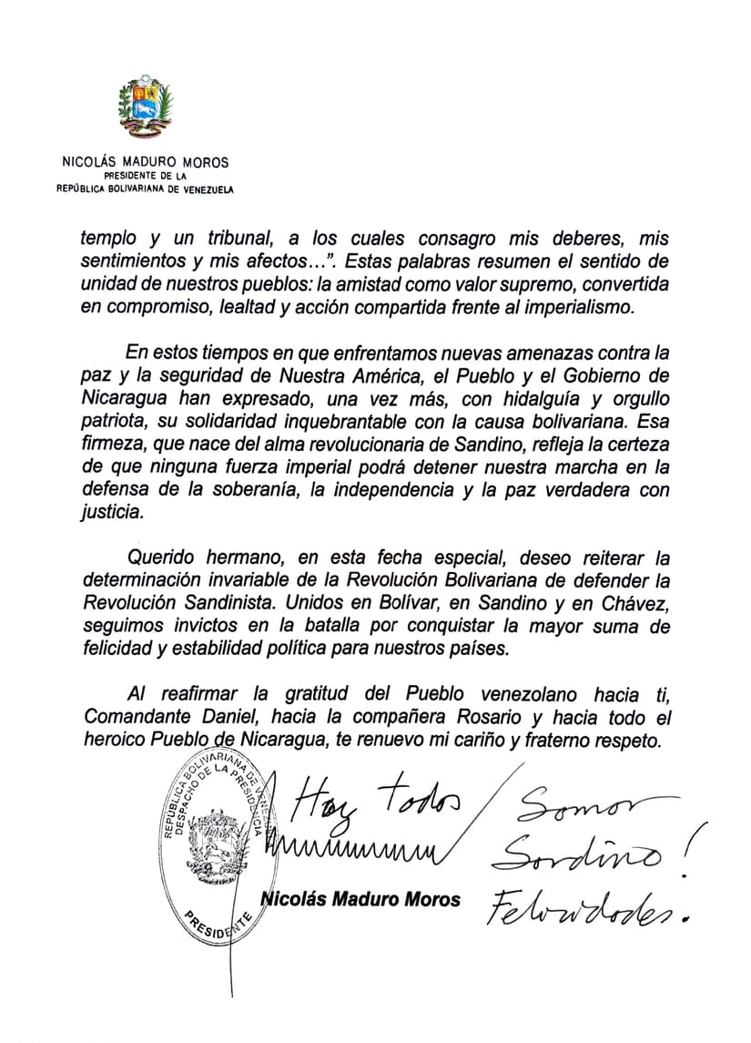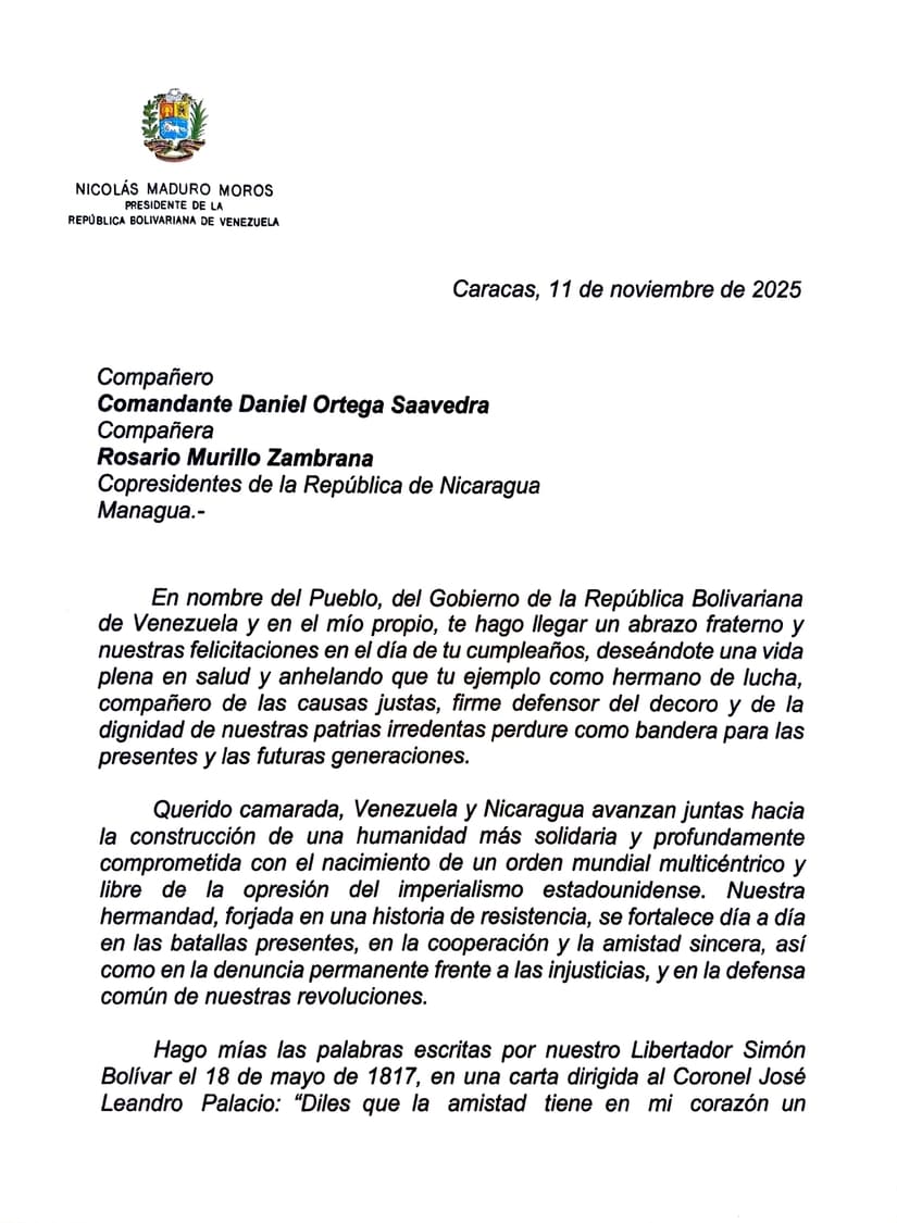 Mensaje de Felicitación del Compañero Nicolás Maduro Moros, Presidente de la República Bolivariana de Venezuela, al Copresidente Comandante Daniel en su Cumpleaños.