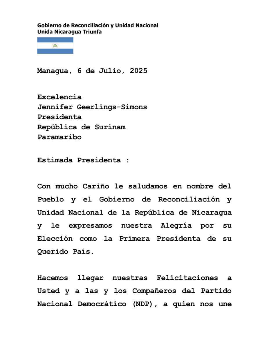 Con mucho Cariño le saludamos en nombre del Pueblo y el Gobierno de Reconciliación y Unidad Nacional de la República de Nicaragua y le expresamos nuestra Alegría por su Elección como la Primera Presidenta de su Querido País.