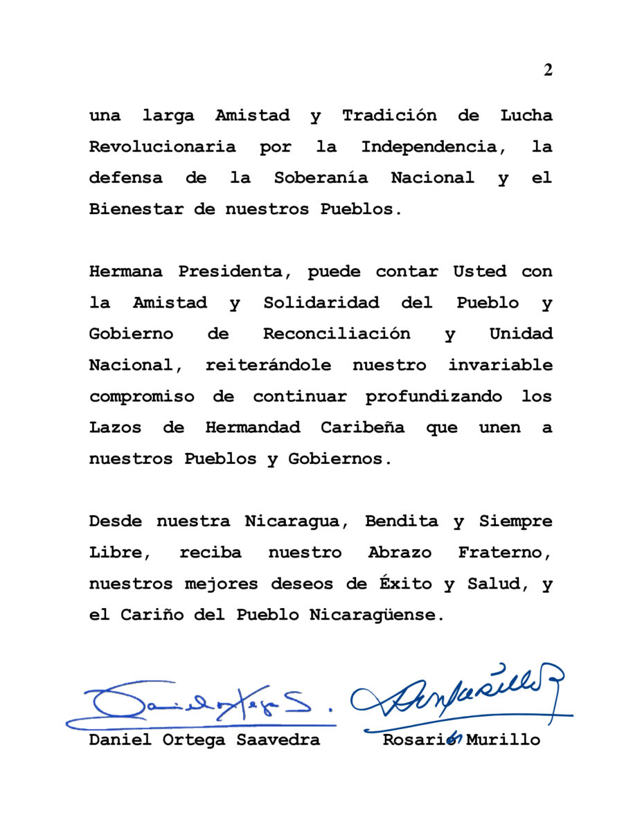 Hermana Presidenta, puede contar Usted con la Amistad y Solidaridad del Pueblo y Gobierno de Reconciliación y Unidad Nacional, reiterándole nuestro invariable compromiso de continuar profundizando los Lazos de Hermandad Caribeña que unen a nuestros Pueblos y Gobiernos.