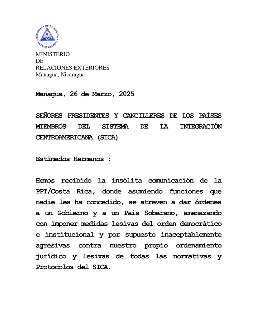 Hemos recibido la insólita comunicación de la PPT/Costa Rica, donde asumiendo funciones que nadie les ha concedido, se atreven a dar órdenes a un Gobierno y a un País Soberano, amenazando con imponer medidas lesivas del orden democrático e institucional y por supuesto inaceptablemente agresivas contra nuestro propio ordenamiento jurídico y lesivas de todas las normativas y Protocolos del SICA.