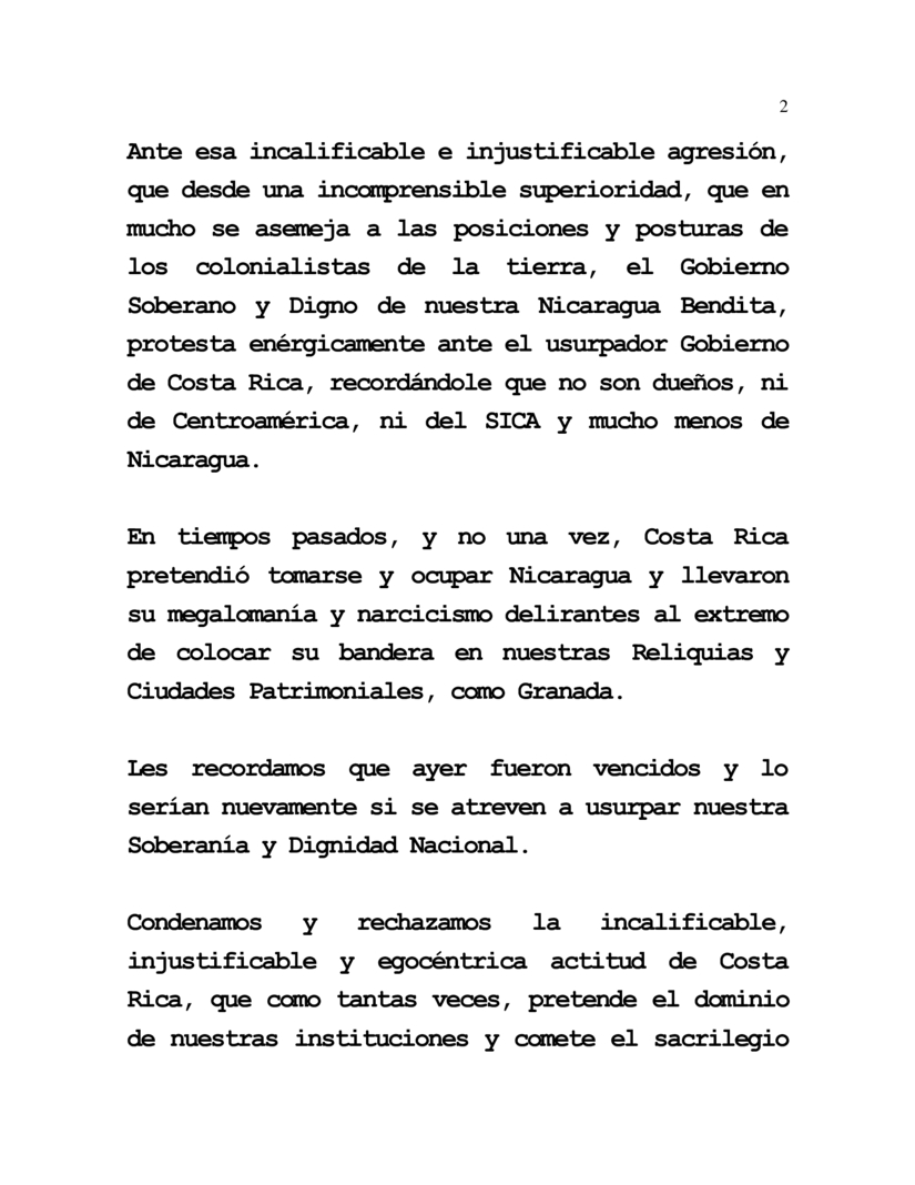 Ante esa incalificable e injustificable agresión, que desde una incomprensible superioridad, que en mucho se asemeja a las posiciones y posturas de los colonialistas de la tierra, el Gobierno Soberano y Digno de nuestra Nicaragua Bendita, protesta enérgicamente ante el usurpador Gobierno de Costa Rica, recordándole que no son dueños, ni de Centroamérica, ni del SICA y mucho menos de Nicaragua.