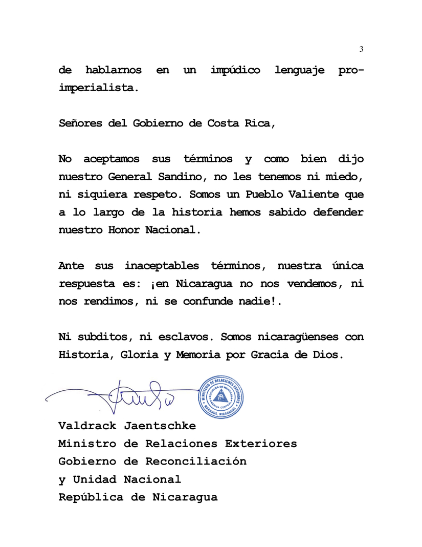 Señores del Gobierno de Costa Rica, No aceptamos sus términos y como bien dijo nuestro General Sandino, no les tenemos ni miedo, ni siquiera respeto. Somos un Pueblo Valiente que a lo largo de la historia hemos sabido defender nuestro Honor Nacional.