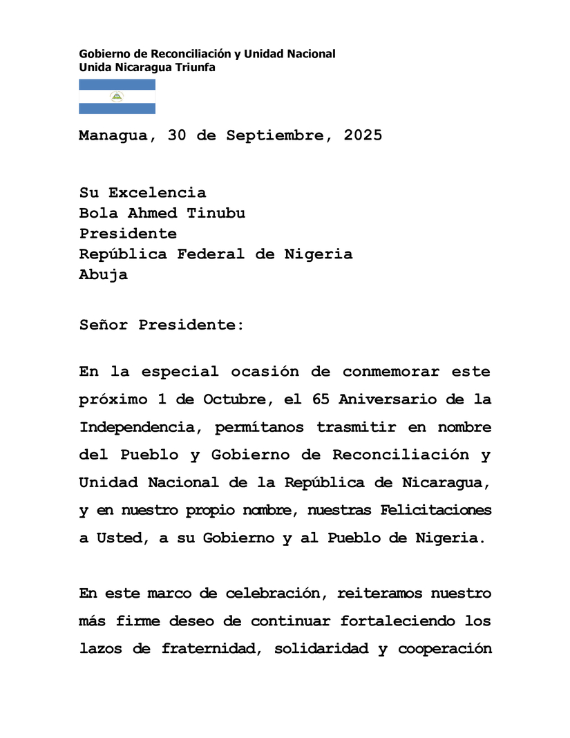 En la especial ocasión de conmemorar este próximo 1 de Octubre, el 65 Aniversario de la Independencia, permítanos trasmitir en nombre del Pueblo y Gobierno de Reconciliación y Unidad Nacional de la República de Nicaragua, y en nuestro propio nombre, nuestras Felicitaciones a Usted, a su Gobierno y al Pueblo de Nigeria.