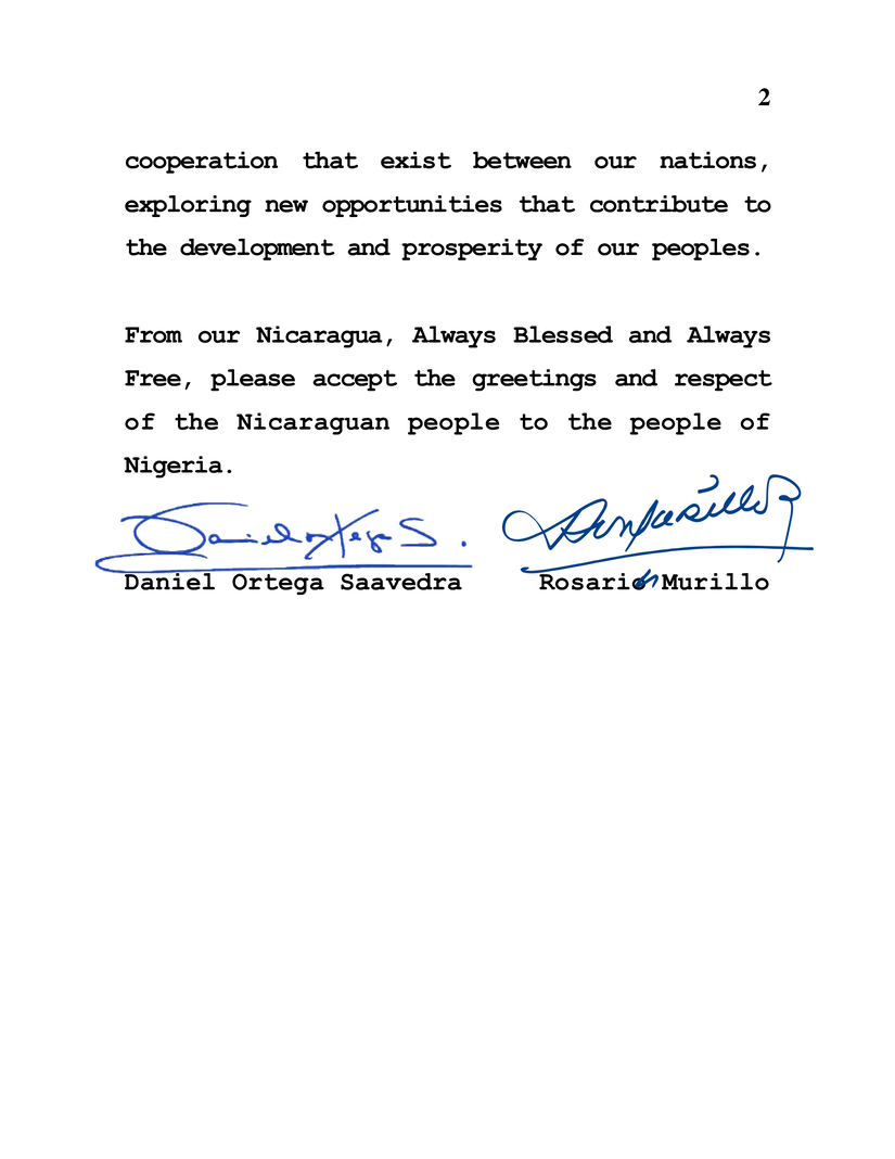 From our Nicaragua, Always Blessed and Always Free, please accept the greetings and respect of the Nicaraguan people to the people of Nigeria.