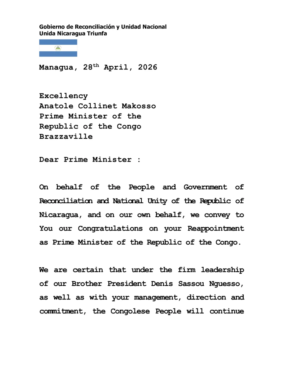 En nombre del Pueblo y Gobierno de Reconciliación y Unidad Nacional de la República de Nicaragua, y en nuestro propio nombre, hacemos llegar nuestras Felicitaciones por haber sido nombrado nuevamente como Primer Ministro de la República del Congo.