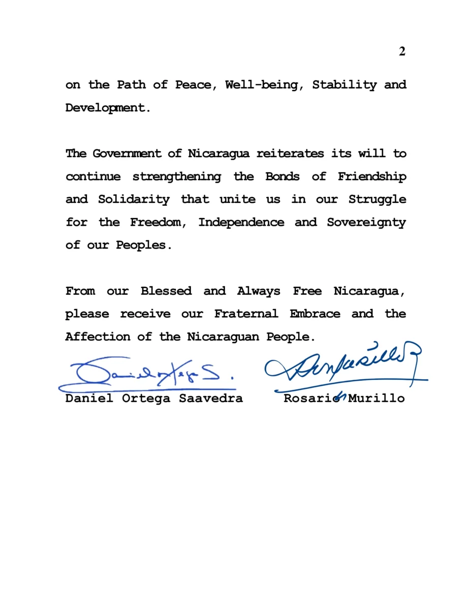 El Gobierno de Nicaragua reitera su voluntad de continuar profundizando los Lazos de Amistad y Solidaridad que nos unen en nuestra su Lucha por la Libertad, la Independencia y la Soberanía de nuestros Pueblos.