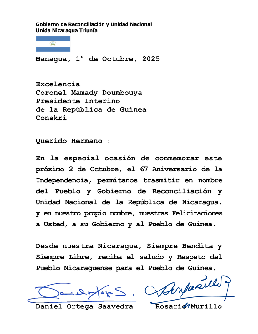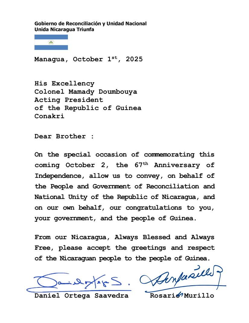 En la especial ocasión de conmemorar este próximo 2 de Octubre, el 67 Aniversario de la Independencia, permítanos trasmitir en nombre del Pueblo y Gobierno de Reconciliación y Unidad Nacional de la República de Nicaragua, y en nuestro propio nombre, nuestras Felicitaciones a Usted, a su Gobierno y al Pueblo de Guinea.