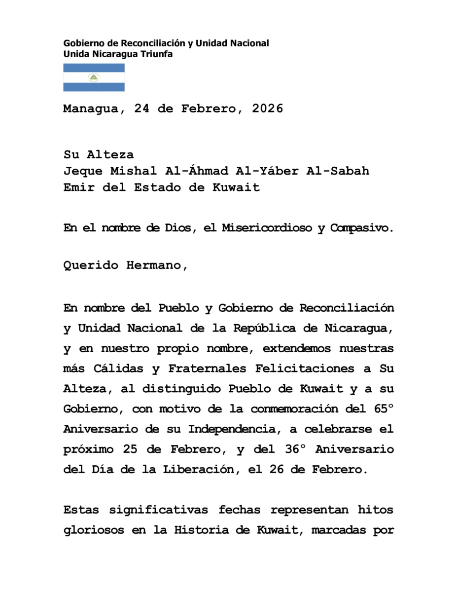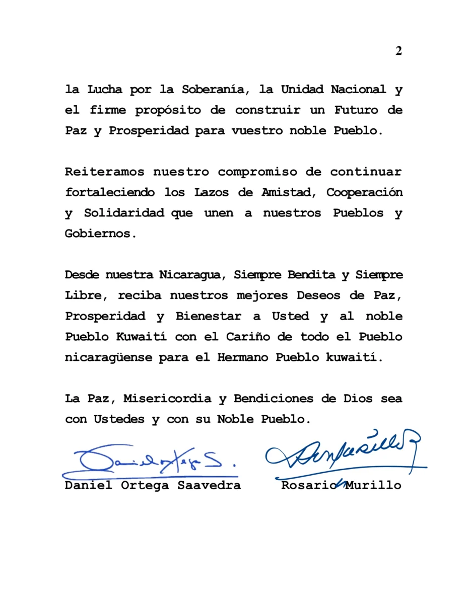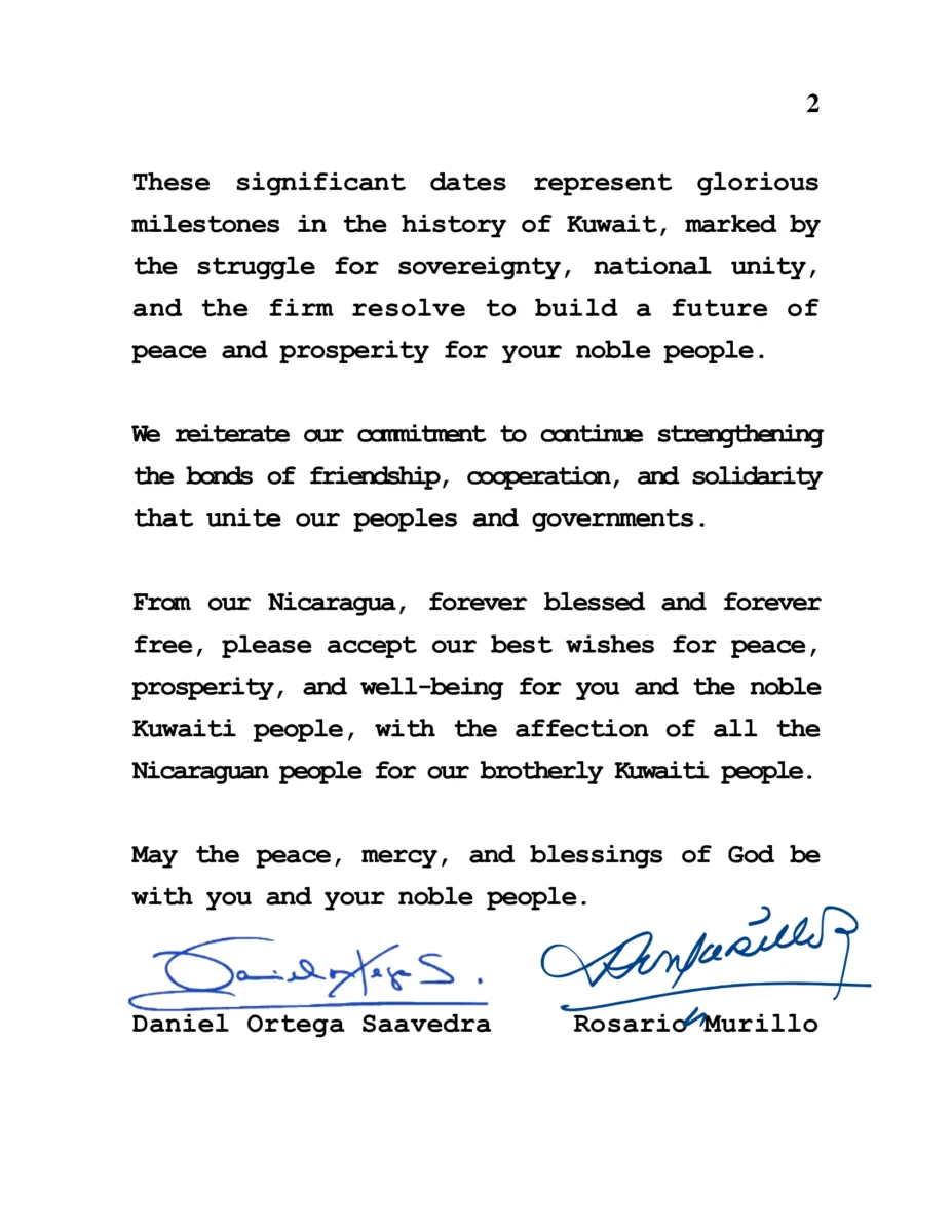 On behalf of the People and Government of Reconciliation and National Unity of the Republic of Nicaragua, and on our own behalf, we extend our warmest and most fraternal congratulations to Your Highness, the distinguished people of Kuwait, and your Government on the occasion of the commemoration of the 65th anniversary of your independence, to be celebrated on February 25, and the 36th anniversary of Liberation Day, on February 26.