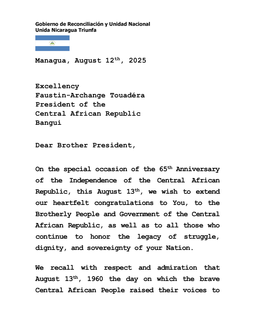 En la ocasión especial de conmemorar el 65º Aniversario de la Independencia de la República Centroafricana, este 13 de Agosto, permítanos expresar nuestras más sinceras felicitaciones a Usted, al Hermano Pueblo y Gobierno de la República Centroafricana, así como a todos los que continúan honrando el Legado de Lucha, Dignidad y Soberanía de su Nación.