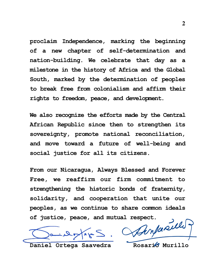 From our Nicaragua, Always Blessed and Forever Free, we reaffirm our firm commitment to strengthening the historic bonds of fraternity, solidarity, and cooperation that unite our peoples, as we continue to share common ideals of justice, peace, and mutual respect.