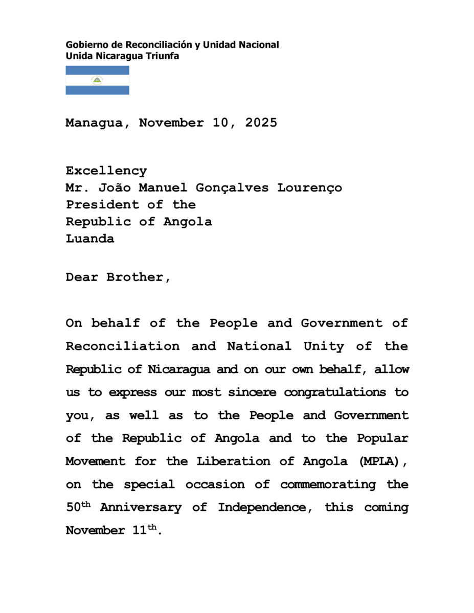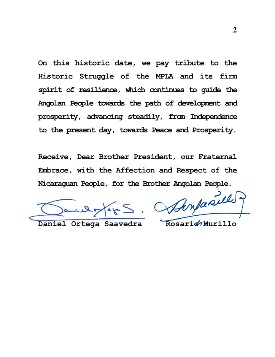 En nombre del Pueblo y Gobierno de Reconciliación y Unidad Nacional de la República de Nicaragua y en nuestro propio nombre, permítanos expresar nuestras más sinceras felicitaciones a Usted, así como al Pueblo y Gobierno de la República de Angola y al Movimiento Popular de Liberación de Angola (MPLA), en la ocasión especial de conmemorar el 50 Aniversario de la Independencia, este próximo 11 de Noviembre.