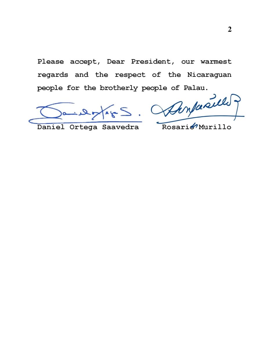 Reciba, Estimado Presidente, nuestro Caluroso Abrazo, con el Respeto del Pueblo Nicaragüense para el Hermano Pueblo de Palaos.