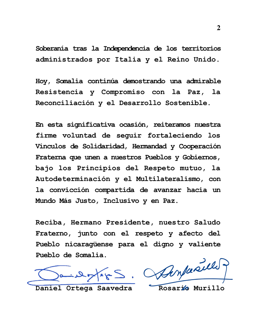 On behalf of the People and Government of Reconciliation and National Unity of the Republic of Nicaragua, and in our own name, we are pleased to extend our most sincere congratulations to You, your Government, and the Brotherly People of the Federal Republic of Somalia, on the occasion of the 65th Anniversary of the Proclamation of your National Independence, to be commemorated this upcoming 1st of July.