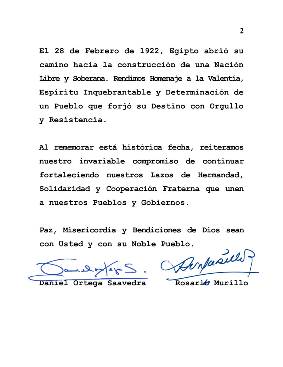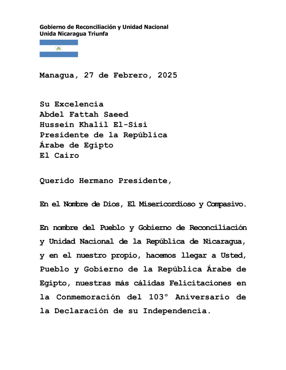 En nombre del Pueblo y Gobierno de Reconciliación y Unidad Nacional de la República de Nicaragua, y en el nuestro propio, hacemos llegar a Usted, Pueblo y Gobierno de la República Árabe de Egipto, nuestras más cálidas Felicitaciones en la Conmemoración del 103º Aniversario de la Declaración de su Independencia.
