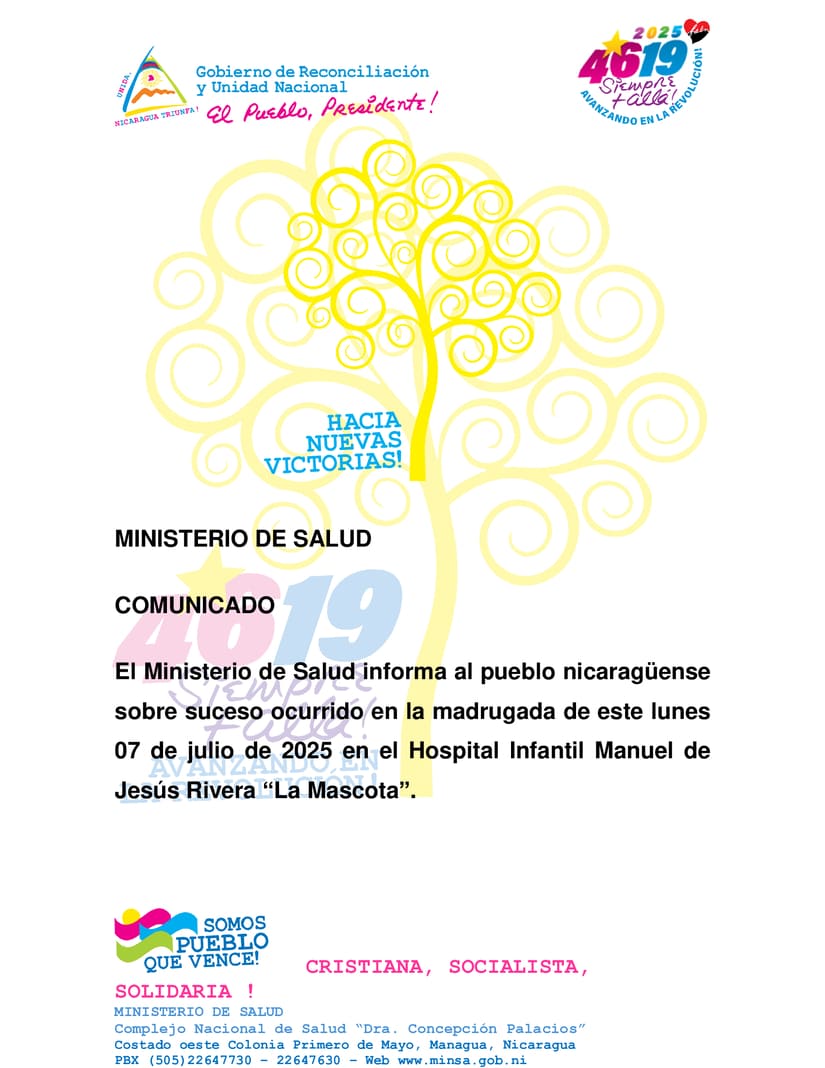 El Ministerio de Salud informa al pueblo nicaragüense sobre suceso ocurrido en la madrugada de este lunes 07 de julio de 2025 en el Hospital Infantil Manuel de Jesús Rivera “La Mascota”.