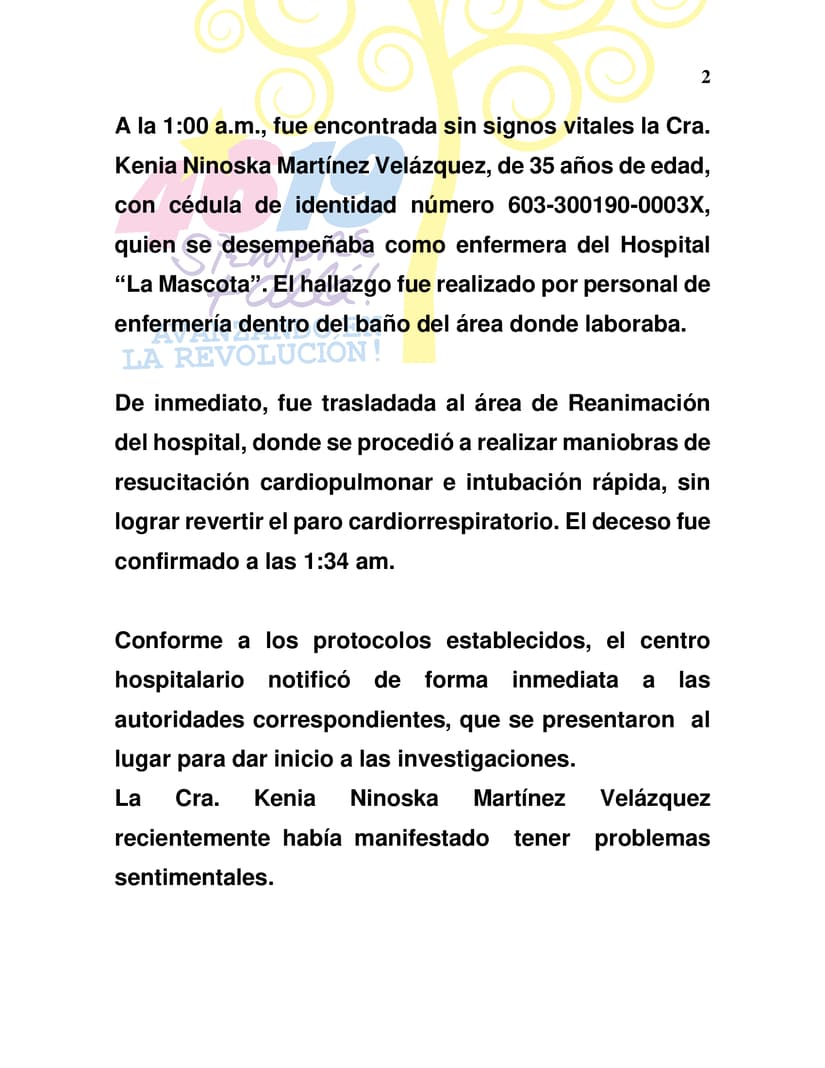 A la 1:00 a.m., fue encontrada sin signos vitales la Cra. Kenia Ninoska Martínez Velázquez, de 35 años de edad, con cédula de identidad número 603-300190-0003X, quien se desempeñaba como enfermera del Hospital “La Mascota”. El hallazgo fue realizado por personal de enfermería dentro del baño del área donde laboraba.