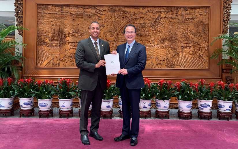 Compañero Michael Campbell presenta Copias de Estilo ante la Cancillería de China