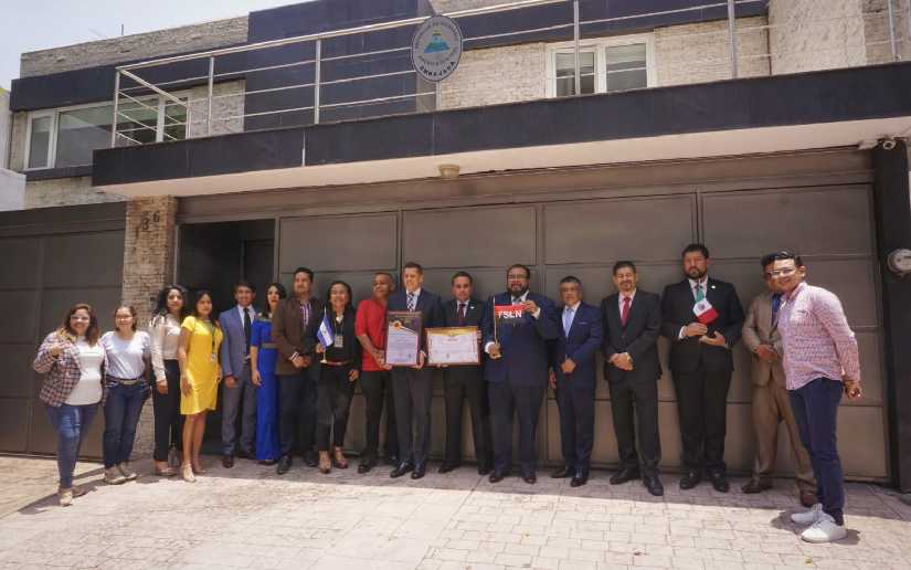 El reconocimiento fue entregado por el Doctor Arturo Cruz Cabrera, Presidente del Claustro Doctoral Iberoamericano y Fundación Liderazgo A.C., al Compañero Juan Carlos Gutiérrez Madrigal, Embajador de Nicaragua en México, en la sede de nuestra Misión Diplomática.