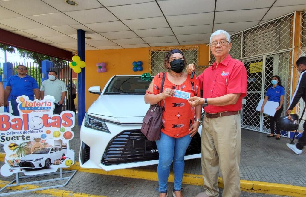 Como premio principal del 3 juego de Balotas, el licenciado Ernesto Vallecillo Gerente General de la Lotería Nacional, entregó un Toyota Yaris 2023 a Rosa Estela Reyes Lara, un ama de casa afortunada quien le compró el boleto a su papá que trabaja como concesionario.