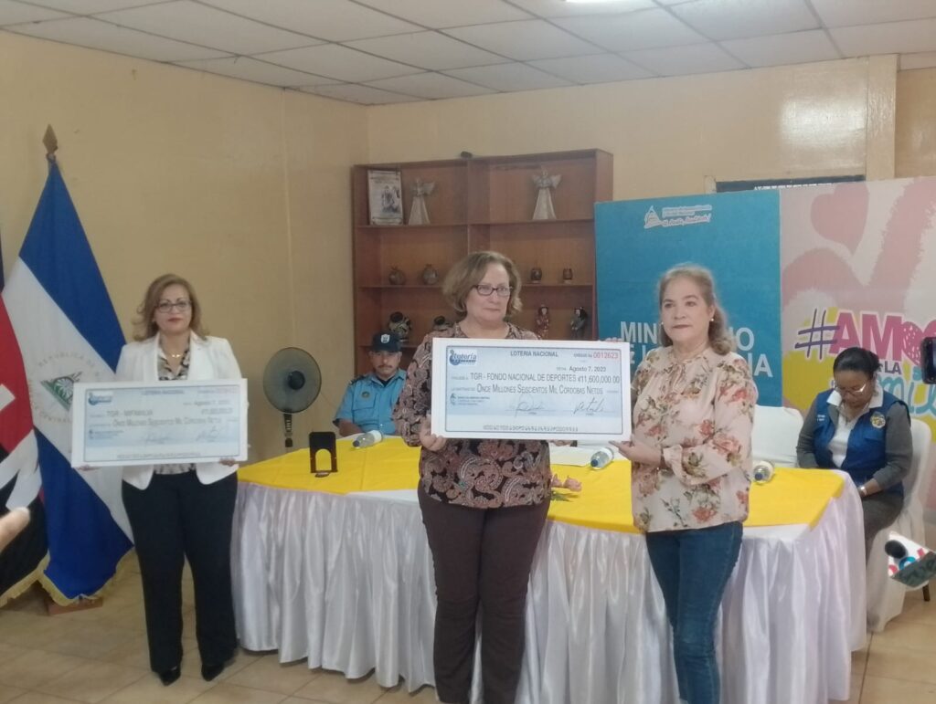 La Lotería Nacional entregó un cheque con 11 millones 600 mil córdobas a la ministra del Ministerio de la Familia, Johana Flores Jiménez, y otro por 11 millones 600 mil córdobas a la directora de Relaciones Públicas e internacionales del Instituto Nicaragüense de Deportes, María Elsa Pérez, para un total de 23 millones 200 mil córdobas entregados, correspondientes al mes de agosto.