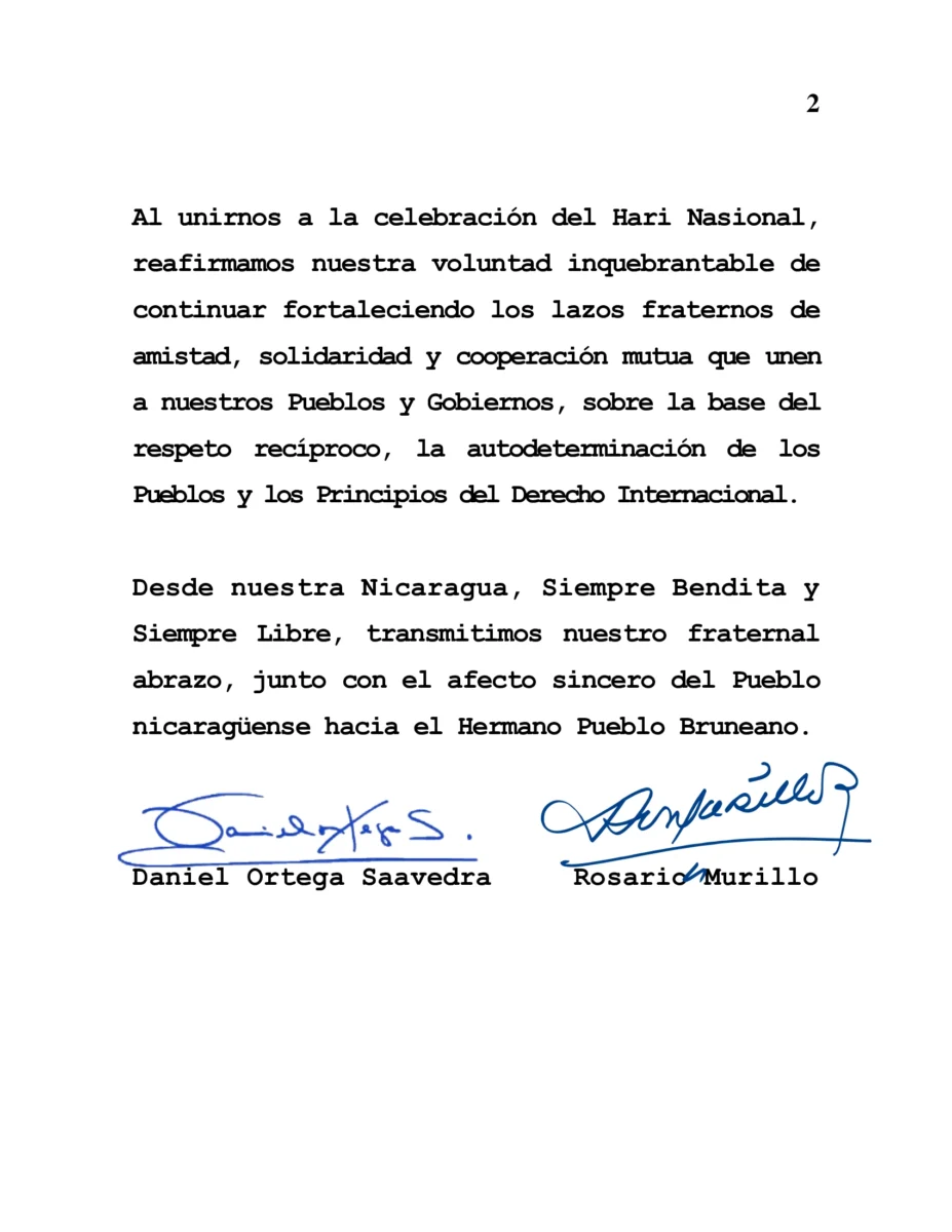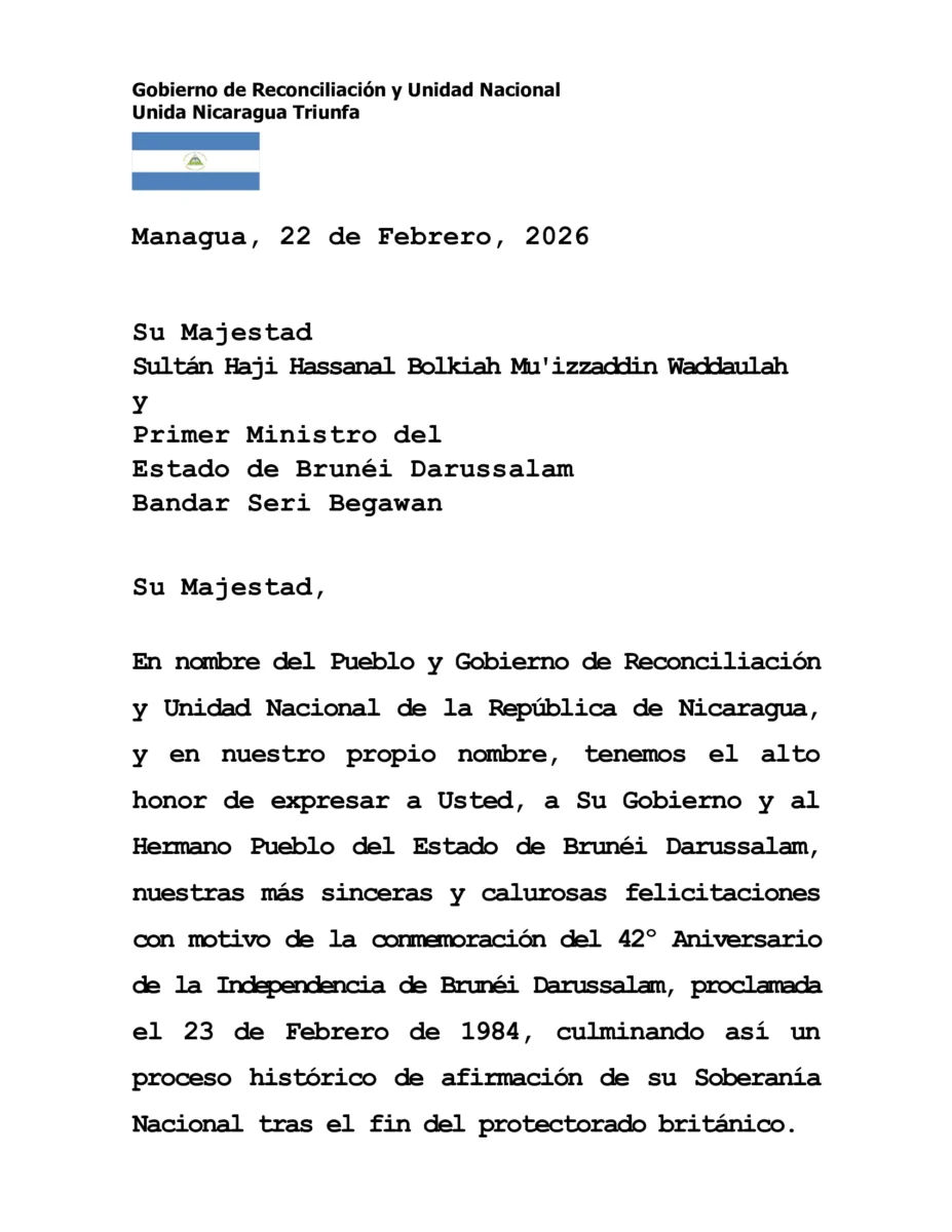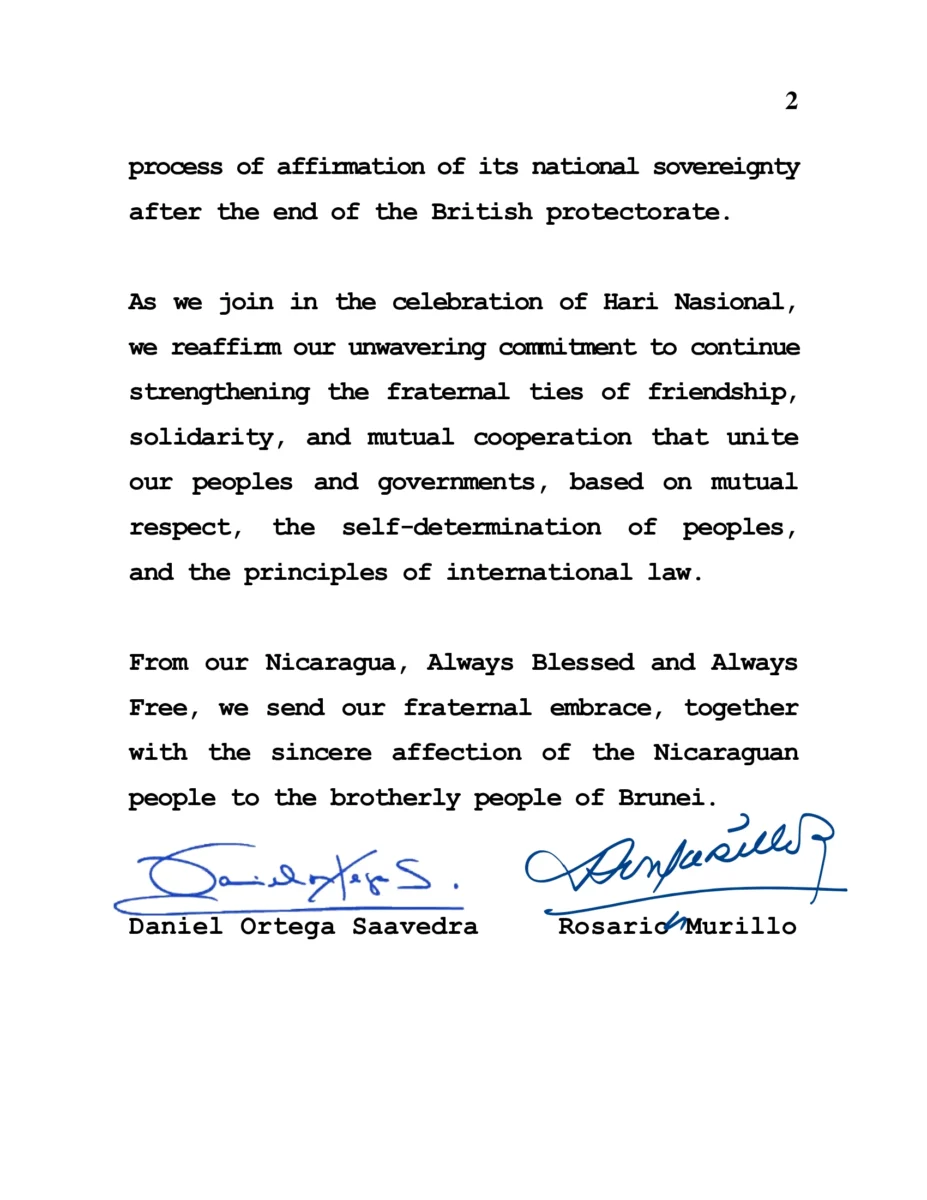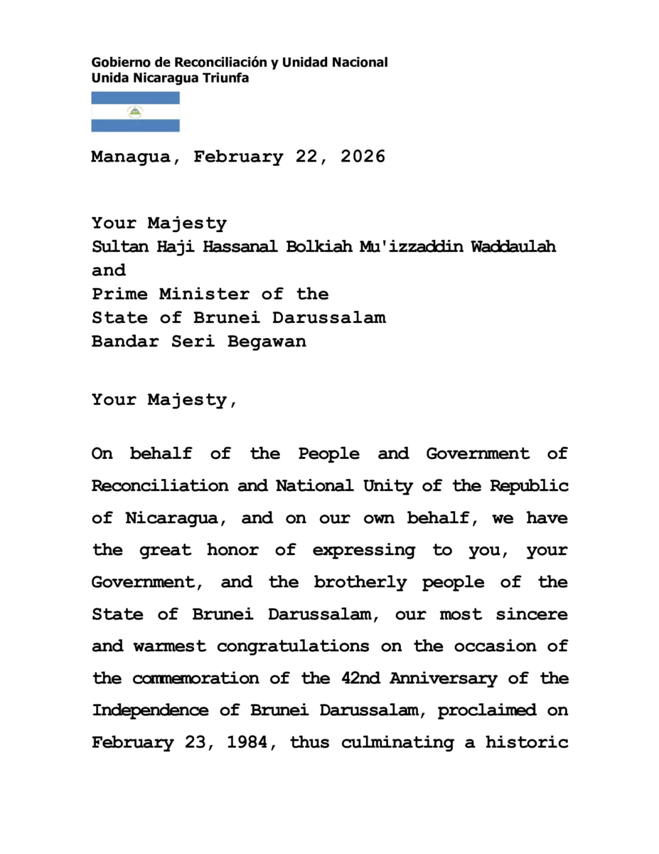 En nombre del Pueblo y Gobierno de Reconciliación y Unidad Nacional de la República de Nicaragua, y en nuestro propio nombre, tenemos el alto honor de expresar a Usted, a Su Gobierno y al Hermano Pueblo del Estado de Brunéi Darussalam, nuestras más sinceras y calurosas felicitaciones con motivo de la conmemoración del 42º Aniversario de la Independencia de Brunéi Darussalam, proclamada el 23 de Febrero de 1984, culminando así un proceso histórico de afirmación de su Soberanía Nacional tras el fin del protectorado británico.