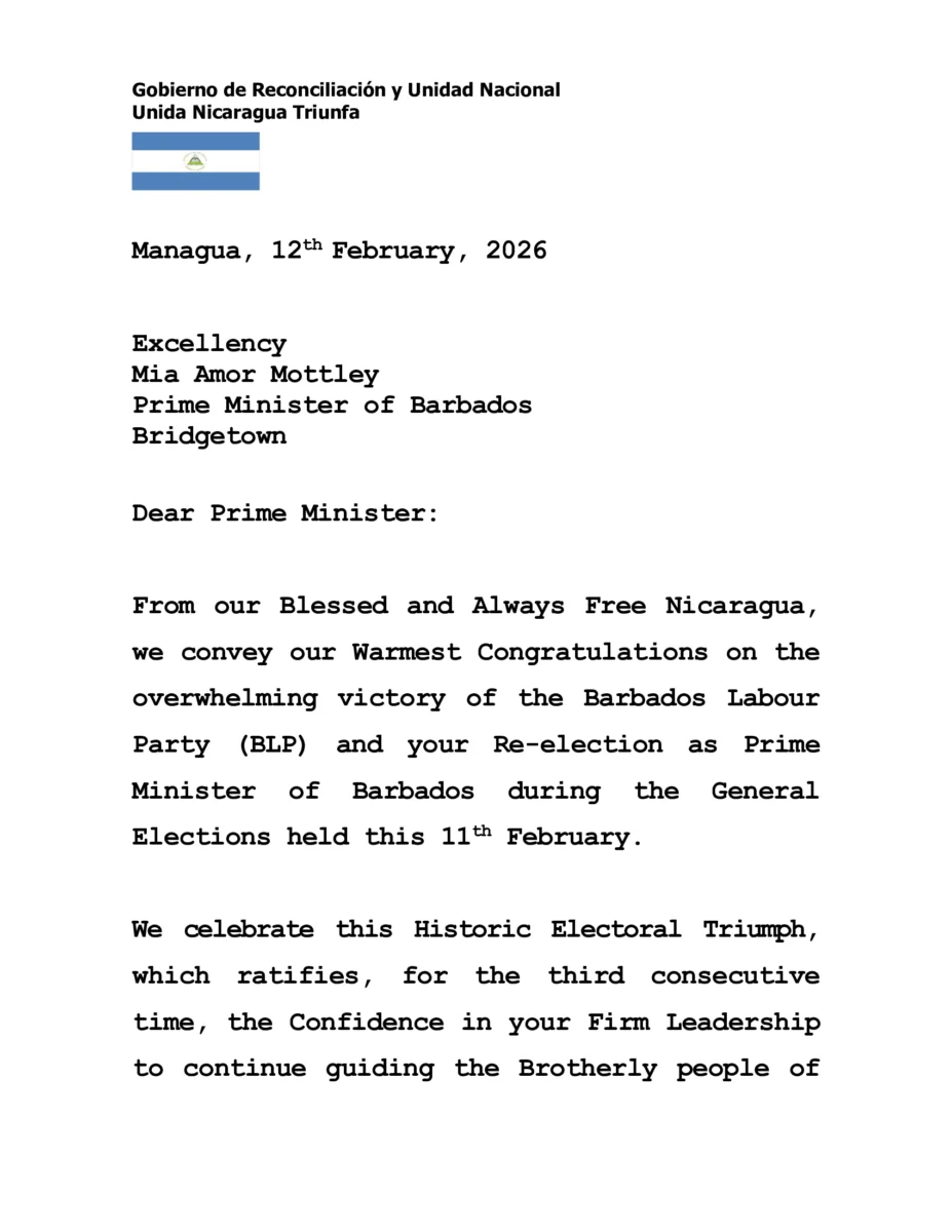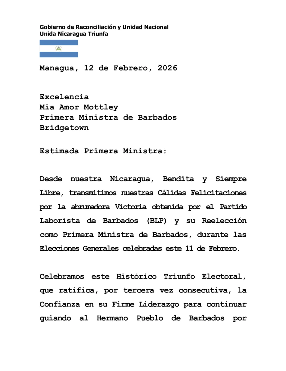 “Esta mañana hemos enviado nuestro saludo a la Primera Ministra de Barbados, hermana, Mía Amor Mottley, lindo nombre, por su reelección histórica”, expresó la Copresidenta de la nación.