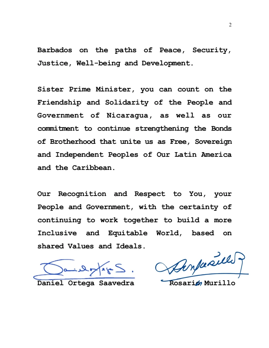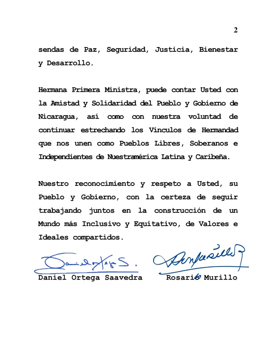 “Le decimos que puede contar con la amistad, hermandad y solidaridad del Pueblo y Gobierno de Nicaragua, así como con nuestro compromiso de seguir estrechando vínculos de hermandad”, añadió.