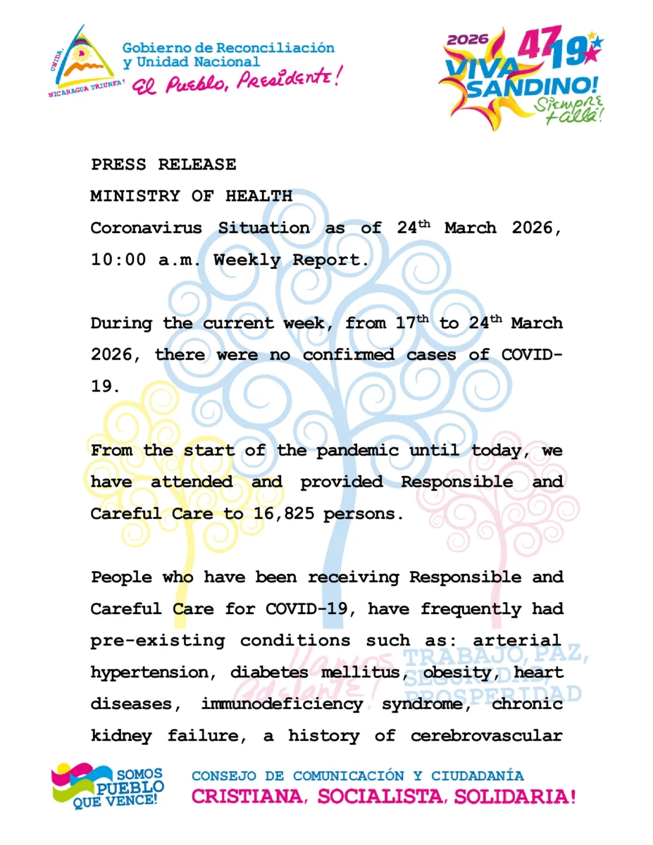 Ministerio de Salud informa que en la presente semana no se reportan casos de COVID-19 en Nicaragua, destacando además que, desde el inicio de la pandemia hasta la fecha, el sistema sanitario ha brindado atención y seguimiento responsable a 16,825 personas que presentaron esta enfermedad, muchas de ellas con padecimientos asociados.
