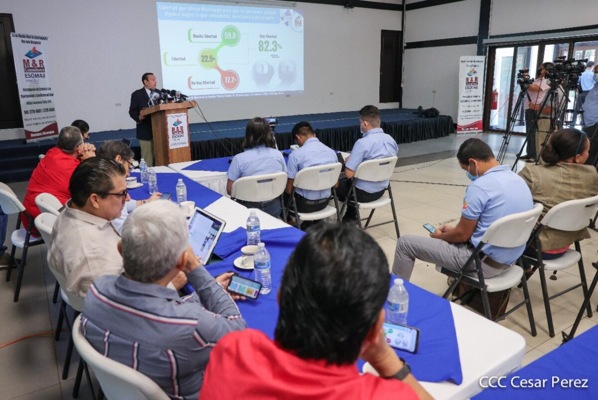 Dicha encuesta fue presentada por el gerente del M&R, Raúl Obregón, donde dio a conocer que el 77.3% de la ciudadanía aprueba el trabajo realizado por el Presidente de Nicaragua, Daniel Ortega, asimismo el 76.3% opina que el gobierno trabaja por los interés de la población en general.