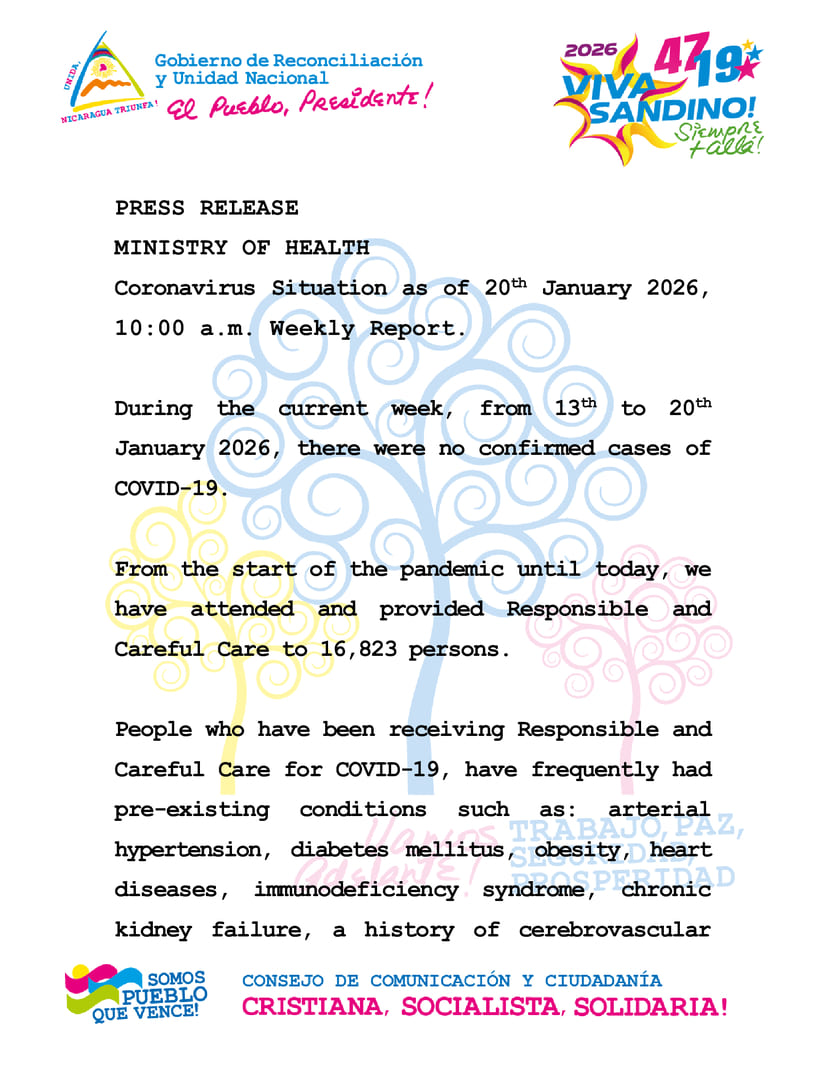 En Nicaragua no se presentan casos de Covid-19 confirmados durante la semana del 13 al 20 de enero de 2026, así lo informó el Ministerio de Salud (MINSA), señalando que tampoco se presentaron fallecidos que sean atribuibles.