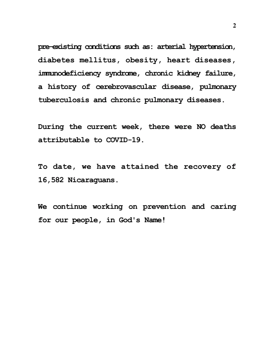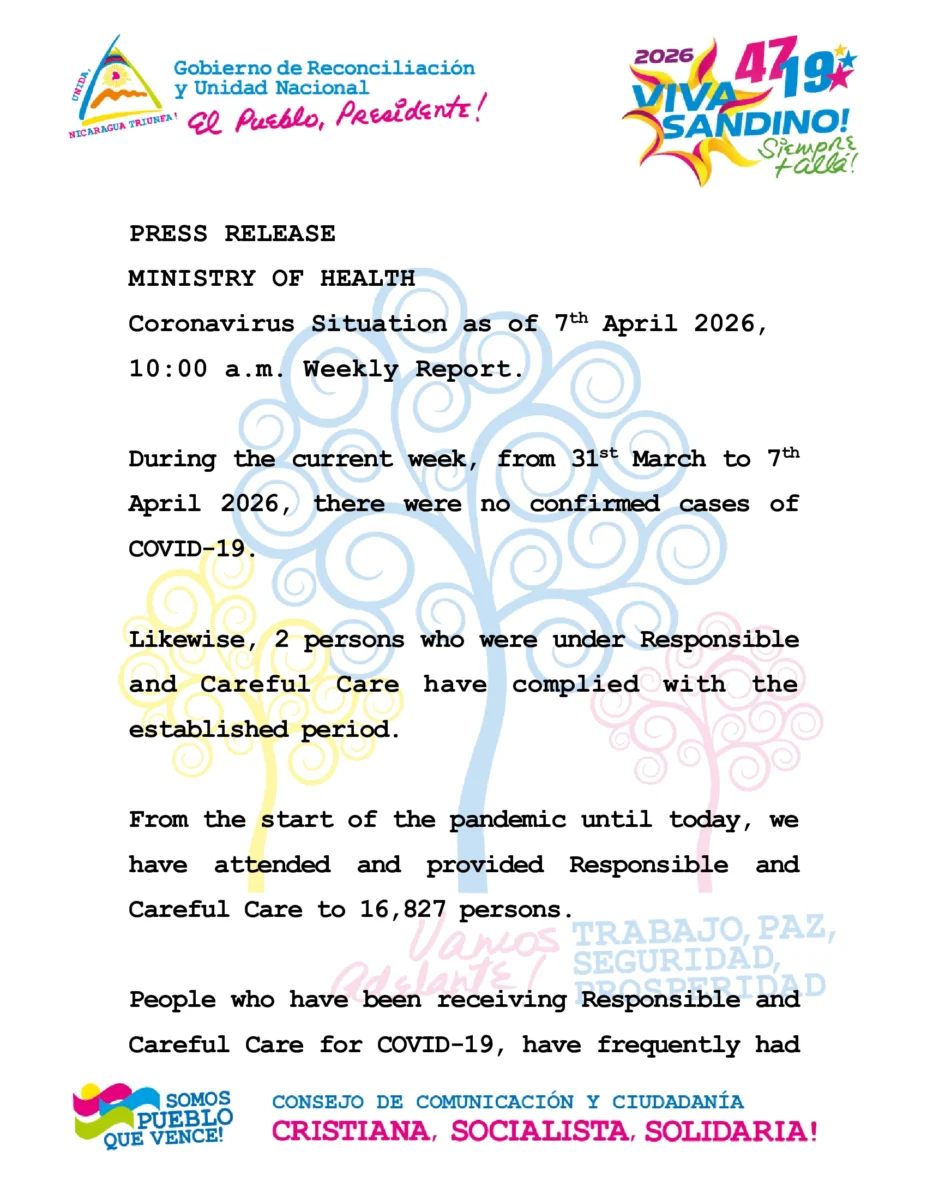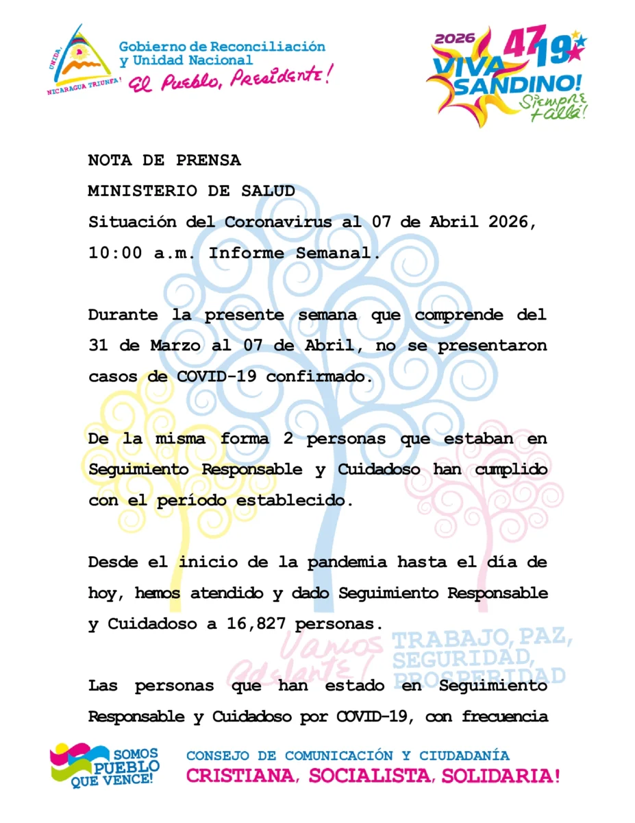 El Ministerio de Salud (MINSA) informó que durante la semana que comprende del 31 de marzo al 7 de abril, no se presentaron casos de Covid -19 confirmados.